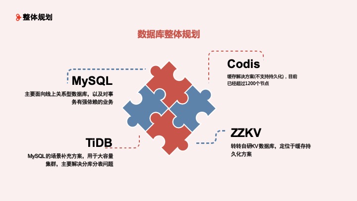 转转的数据库有以下类型:MySQL 主要面向线上关系型数据库,以及对事务有强依赖业务;TiDB 是 MySQL 的场景补充方案,用于大容量集群,主要解决分库分表问题; 缓存数据跑在Codis(不支持持久化),目前已超过1200个节点;ZZKV 是转转自研 KV 数据库,在 TiKV 的基础上封装了协议,定位于缓存持久化方案。