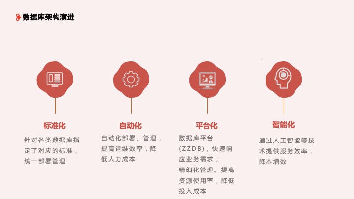 平台化:数据库平台 (ZZDB),快速响应业务需求,精细化管理,提高资源使用率,降低投入成本;