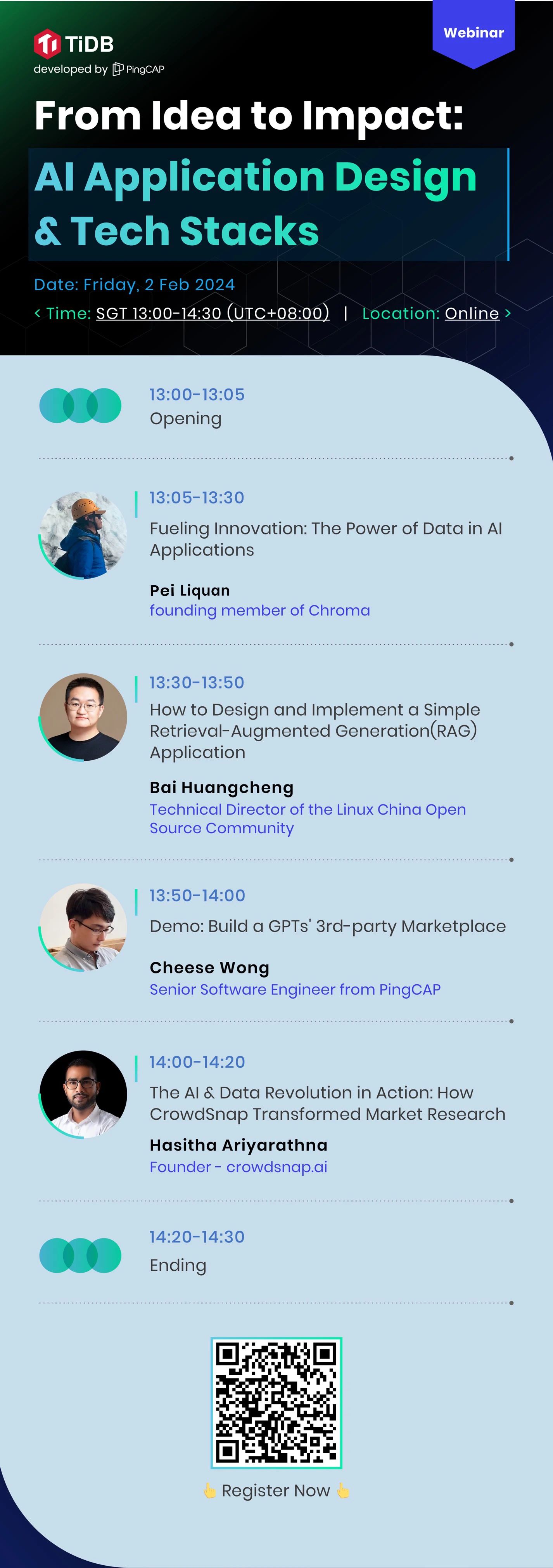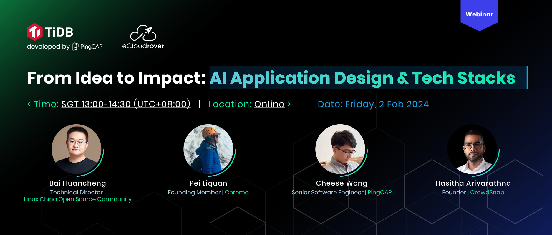 随着 AI 的飞速发展,基于 AI 的应用开发正成为科技创新的新方向。设计应用的方式和构建 AI 应用所需的数据基础设施至关重要。我们邀请到了 Linux 中国开源社区的技术总监白宦成、Chroma 的创始成员裴立全、PingCAP 的高级软件工程师王琦智和 CrowdSnap 的创始人 Hasitha Ariyarathna 四位技术专家来分享他们的见解与经验,和大家聊聊如何设计 AI 应用,以及构建 AI 应用过程中需要用到的技术栈。