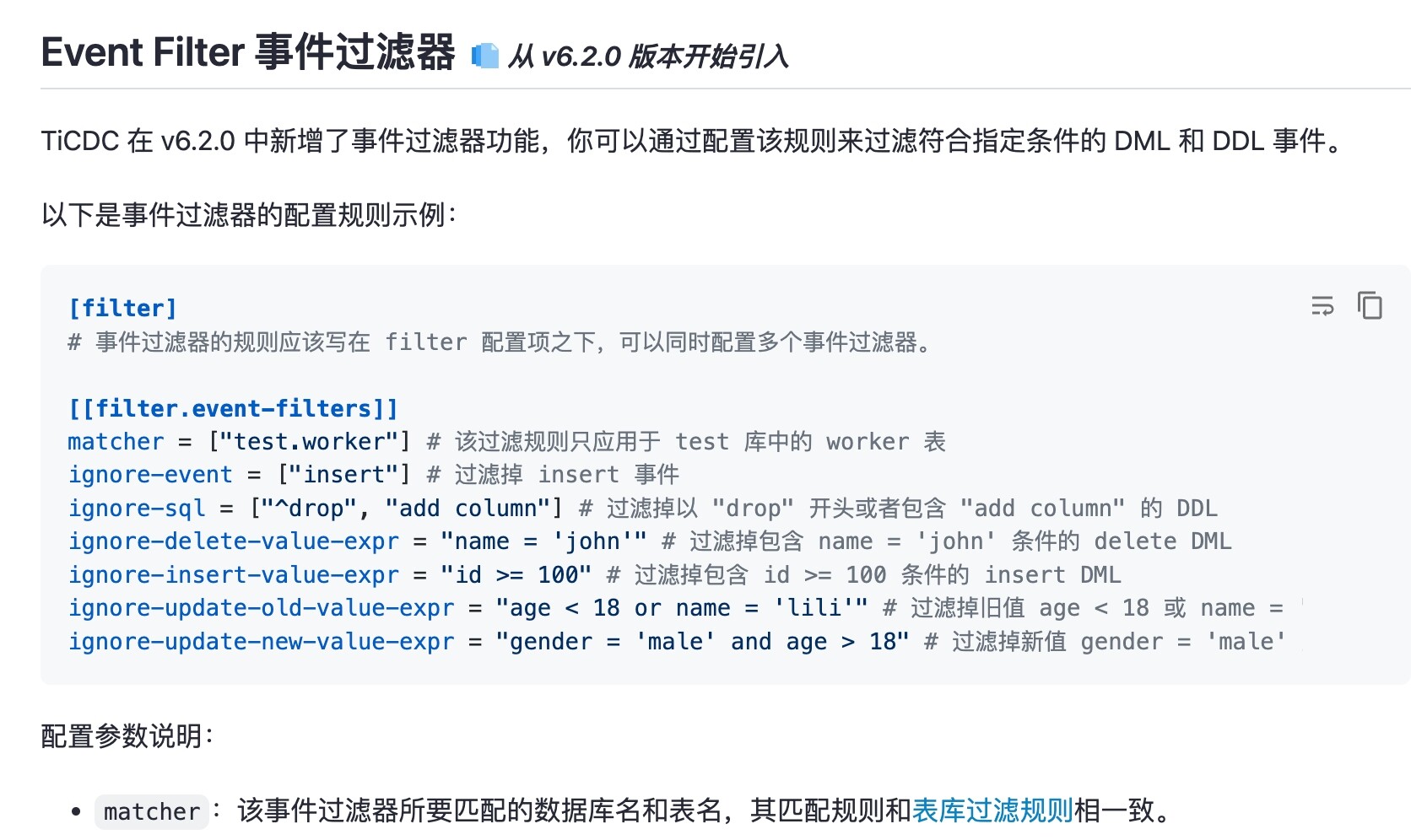 https://docs.pingcap.com/zh/tidb/stable/ticdc-filter