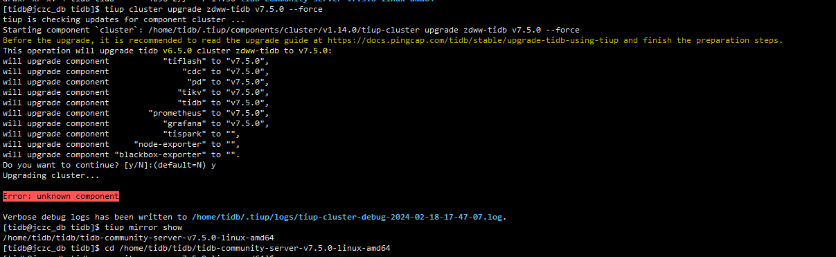 第一个截图里面已经写没找到tispark对应的升级包了,是不是不加-force就可以了。