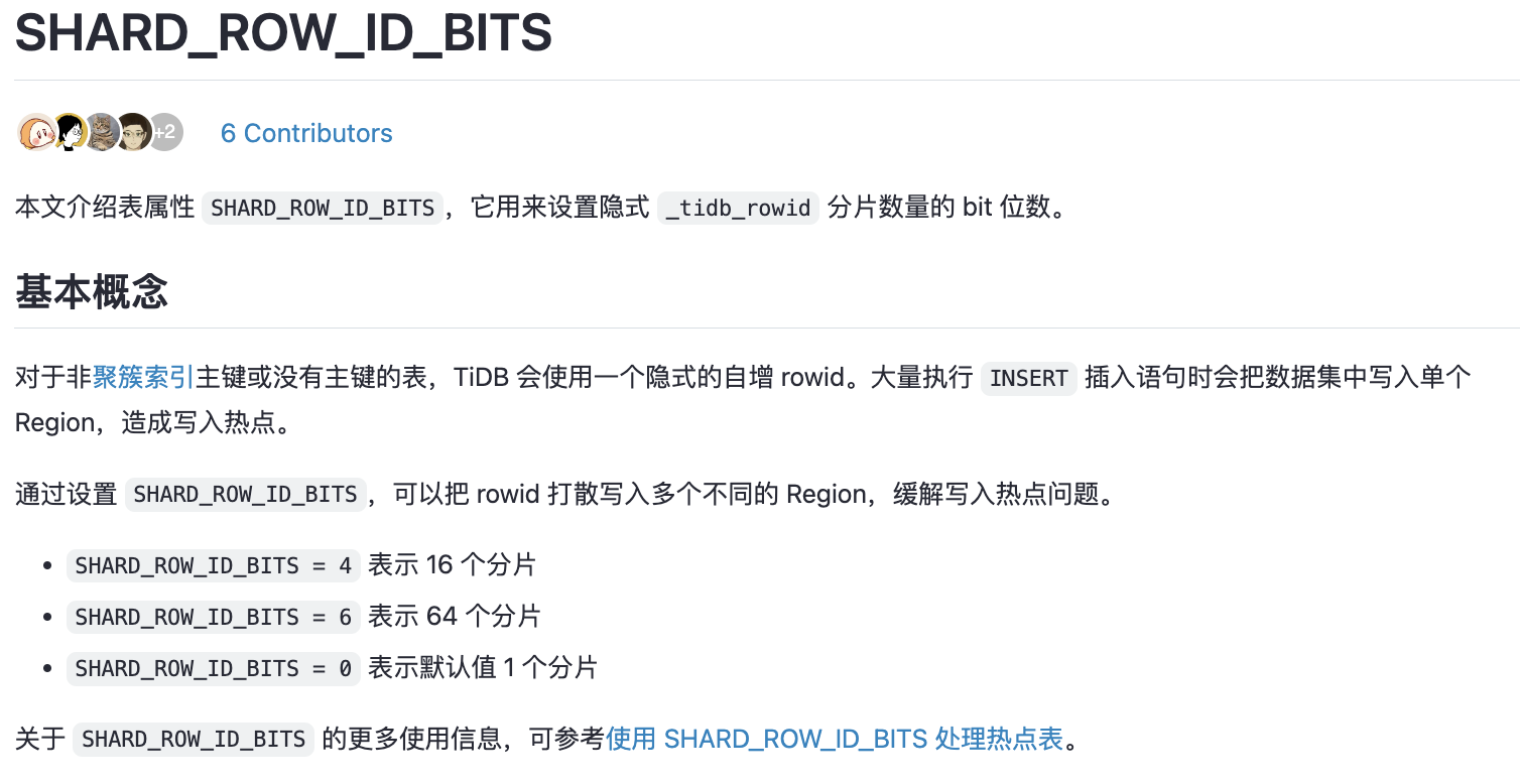 SHARD_ROW_ID_BITS 参数的作用就是定义了 ROW_ID 中用于表示分片 ID 的位数,帮助 TiDB 进行分片表的数据分布和管理。