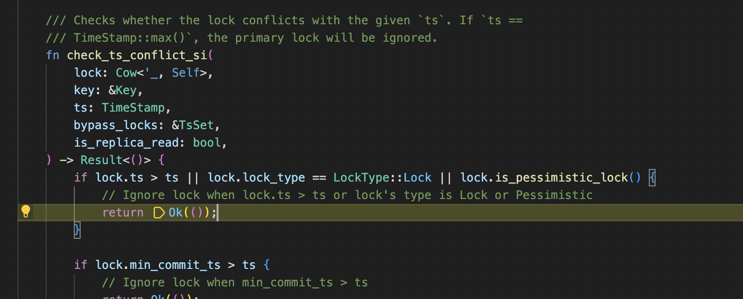 即使 RC 级别的事务,TIKV 也是会去 LOCK CF 获取锁信息的,虽然读出来悲观锁后,会跳过,这样做应该是为了保障悲观锁乐观锁同时存在的场景,防止 RC 级别的事务读取不到乐观锁新提交的事务。如果 RC 级别的快照读遇到乐观锁,那么也会返回锁冲突然后进行等锁、重试。