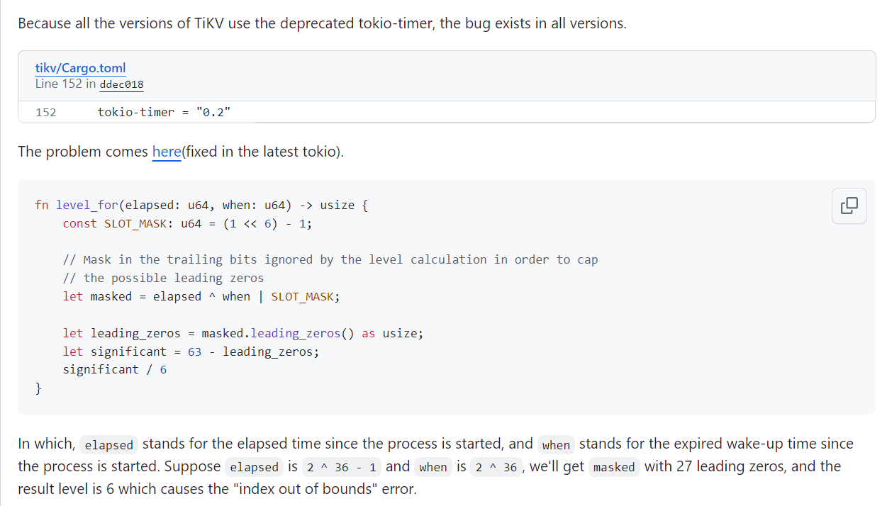 [2024/03/04 05:55:51.506 +08:00] [FATAL] [lib.rs:463] ["index out of bounds: the len is 6 but the index is 6"] [backtrace="stack backtrace:\n 0: tikv_util::set_panic_hook::{{closure}}\n at components/tikv_util/src/lib.rs:462\n 1: std::panicking::rust_panic_with_hook\n at library/std/src/panicking.rs:595\n 2: std::panicking::begin_panic_handler::{{closure}}\n at library/std/src/panicking.rs:497\n 3: std::sys_common::backtrace::__rust_end_short_backtrace\n at library/std/src/sys_common/backtrace.rs:141\n 4: rust_begin_unwind\n at library/std/src/panicking.rs:493\n 5: core::panicking::panic_fmt\n at library/core/src/panicking.rs:92\n 6: core::panicking::panic_bounds_check\n at library/core/src/panicking.rs:69\n 7: <usize as core::slice::index::SliceIndex<[T]>>::index_mut\n at /rustc/16bf626a31cb5b121d0bca2baa969b4f67eb0dab/library/core/src/slice/index.rs:188\n core::slice::index::<impl core::ops::index::IndexMut<I> for [T]>::index_mut\n at /rustc/16bf626a31cb5b121d0bca2baa969b4f67eb0dab/library/core/src/slice/index.rs:26\n <alloc::vec::Vec<T,A> as core::ops::index::IndexMut<I>>::index_mut\n at /rustc/16bf626a31cb5b121d0bca2baa969b4f67eb0dab/library/alloc/src/vec/mod.rs:2398\n tokio_timer::wheel::Wheel<T>::insert\n at /rust/registry/src/github.com-1ecc6299db9ec823/tokio-timer-0.2.13/src/wheel/mod.rs:114\n tokio_timer::timer::Timer<T,N>::add_entry\n at /rust/registry/src/github.com-1ecc6299db9ec823/tokio-timer-0.2.13/src/timer/mod.rs:324\n 8: tokio_timer::timer::Timer<T,N>::process_queue\n at /rust/registry/src/github.com-1ecc6299db9ec823/tokio-timer-0.2.13/src/timer/mod.rs:301\n 9: <tokio_timer::timer::Timer<T,N> as tokio_executor::park::Park>::park\n at /rust/registry/src/github.com-1ecc6299db9ec823/tokio-timer-0.2.13/src/timer/mod.rs:361\n tokio_timer::timer::Timer<T,N>::turn\n at /rust/registry/src/github.com-1ecc6299db9ec823/tokio-timer-0.2.13/src/timer/mod.rs:256\n 10: tikv_util::timer::start_global_timer::{{closure}}\n at components/tikv_util/src/timer.rs:98\n 11: std::sys_common::backtrace::__rust_begin_short_backtrace\n at /rustc/16bf626a31cb5b121d0bca2baa969b4f67eb0dab/library/std/src/sys_common/backtrace.rs:125\n 12: std::thread::Builder::spawn_unchecked::{{closure}}::{{closure}}\n at /rustc/16bf626a31cb5b121d0bca2baa969b4f67eb0dab/library/std/src/thread/mod.rs:474\n 13: <std::panic::AssertUnwindSafe<F> as core::ops::function::FnOnce<()>>::call_once\n at /rustc/16bf626a31cb5b121d0bca2baa969b4f67eb0dab/library/std/src/panic.rs:344\n 14: std::panicking::try::do_call\n at /rustc/16bf626a31cb5b121d0bca2baa969b4f67eb0dab/library/std/src/panicking.rs:379\n std::panicking::try\n at /rustc/16bf626a31cb5b121d0bca2baa969b4f67eb0dab/library/std/src/panicking.rs:343\n std::panic::catch_unwind\n at /rustc/16bf626a31cb5b121d0bca2baa969b4f67eb0dab/library/std/src/panic.rs:431\n std::thread::Builder::spawn_unchecked::{{closure}}\n at /rustc/16bf626a31cb5b121d0bca2baa969b4f67eb0dab/library/std/src/thread/mod.rs:473\n core::ops::function::FnOnce::call_once{{vtable.shim}}\n at /rustc/16bf626a31cb5b121d0bca2baa969b4f67eb0dab/library/core/src/ops/function.rs:227\n 15: <alloc::boxed::Box<F,A> as core::ops::function::FnOnce<Args>>::call_once\n at /rustc/16bf626a31cb5b121d0bca2baa969b4f67eb0dab/library/alloc/src/boxed.rs:1546\n <alloc::boxed::Box<F,A> as core::ops::function::FnOnce<Args>>::call_once\n at /rustc/16bf626a31cb5b121d0bca2baa969b4f67eb0dab/library/alloc/src/boxed.rs:1546\n std::sys::unix::thread::Thread::new::thread_start\n at library/std/src/sys/unix/thread.rs:71\n 16: start_thread\n 17: clone\n"] [location=/rust/registry/src/github.com-1ecc6299db9ec823/tokio-timer-0.2.13/src/wheel/mod.rs:114] [thread_name=timer]