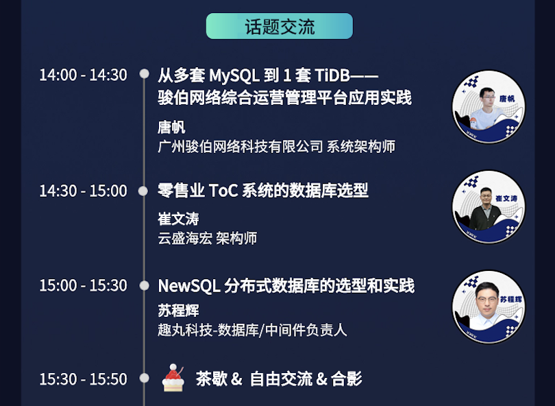 | 崔文涛 | 云盛海宏 架构师 | 云盛海宏ToC系统架构师,研究技术方向微服务架构,常用中间件,云原生等 | 零售业ToC系统的数据库选型 | 分享云盛海宏在数据库选型的思路,1:业务系统使用数据库Mycat+Mysql遇到了哪些问题 2:系统数据库从Mycat+Mysql迁移到TiDB关注的问题及验证方法 3:分享迁移完成后的效果 | 1:数据库迁移需要注意的问题及验证方法 2:业务系统数据库从Mycat+Mysql迁移到TiDB的提升效果 |