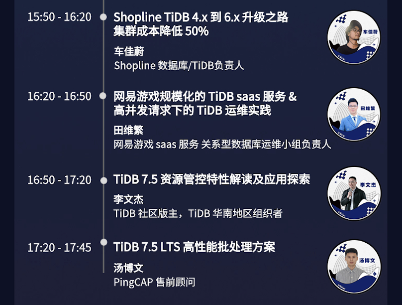 | 汤博文 | PingCAP - 售前顾问 | 过去曾担任 Oracle DBA, EBS R12 DBA, MySQL DBA,现任 PingCAP 售前顾问。 作为 TiDB 分布式数据库售前专家,致力于帮助客户解决数据库方面的挑战,提供适合的解决方案,实现需求响应、效率提升以及降低硬件、人力成本的目标。 工作之外,喜欢美食与大自然。欢迎一起交流。 | TiDB 7.5 LTS 高性能批处理方案 | 分享我在服务客户的过程中遇到的一些常见批处理场景,以及一些优化方案,结合实际测试探讨更多解决方案。 | 1. 了解 BATCH DML 如何在单表批处理场景获得收益;2. 了解 IMPORT INTO 高性能导入方案;3. 了解数据导出场景,还有哪些实现方式。 |