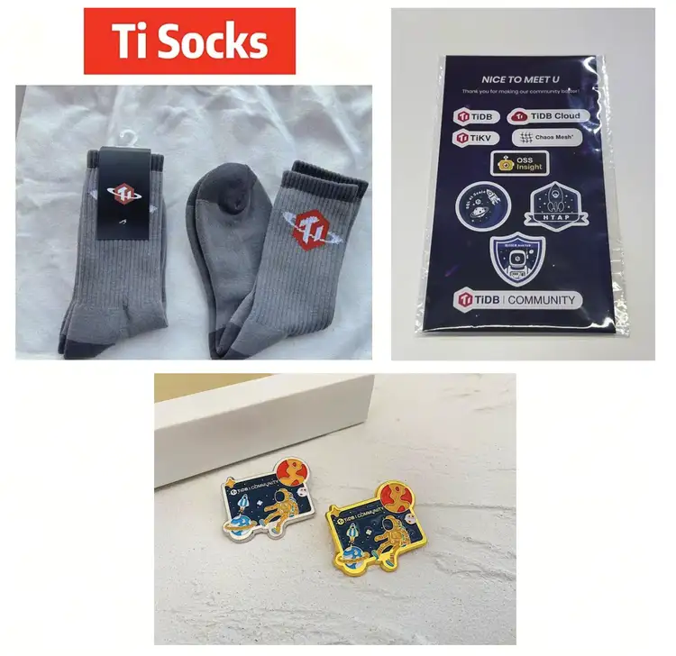包括但不限于 2024 新款 Ti 渔夫帽、2024 TiDB 社区新款双肩背包、问 Ti 不大 可伸缩折叠咖啡杯、2024 新款手机平板支架、社区徽章旗帜、 定制款可加热鼠标垫、 TiDB 定制机械键盘、宇航员款帆布袋等等精美周边!