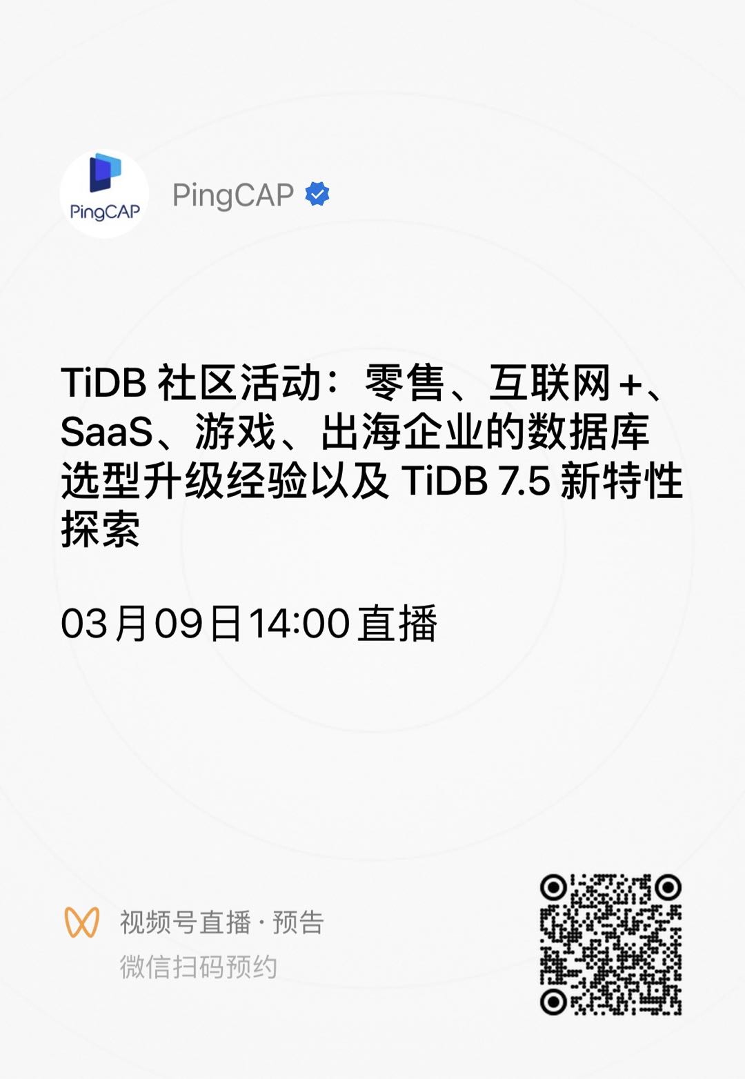 分享形式:线下分享 + 线上直播(请关注 PingCAP 视频号、社区互助交流群内推送)