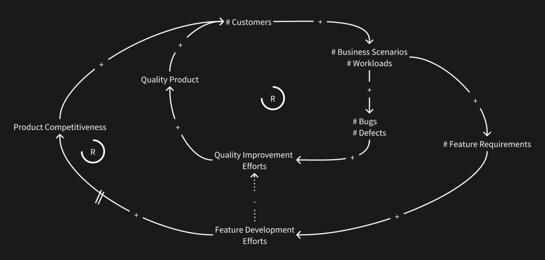 继续上面的因果回路,我们可以扩展另一个增强回路。当我们承接了客户更多的场景和负载之后,客户对我们提出了更多的要求,也就是会给我们提更多的功能需求。在这种情况下,我们就需要投入到新功能的开发当中。新功能做的越多,我们的产品在更多的维度上就更有竞争力,自然就会吸引更多的客户去使用。