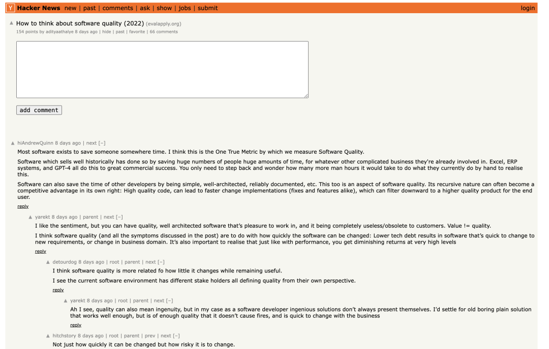 ● 一个很有意思的事情,在我当天 2024-02-24 发布这篇文章的时候,Hacker News 上也有一篇讨论软件质量的帖子上了首页, How to think about software quality (2022) | Hacker News,看来不只是我,大概率全球的开发者也在头疼这个问题吧。