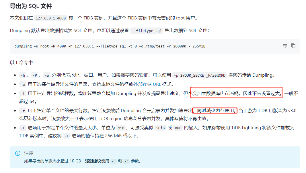tiup dumpling -u root -P 4000 -h xxxx -p 'xxxxxxx' --filetype sql -o /data/export -F 500MiB -t 1 --params "tidb_distsql_scan_concurrency=1,tidb_mem_quota_query=209715200" --consistency=auto