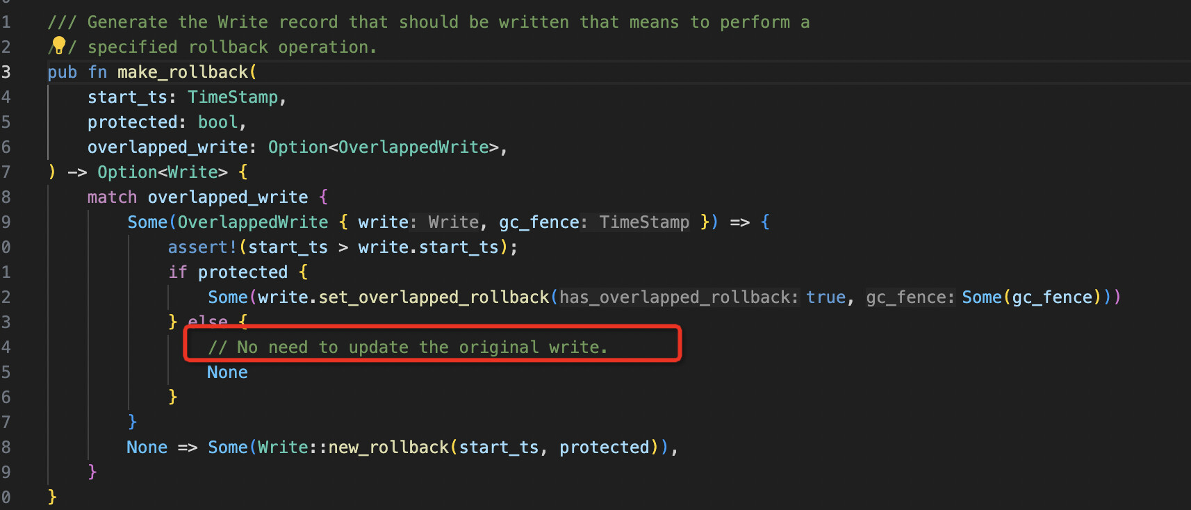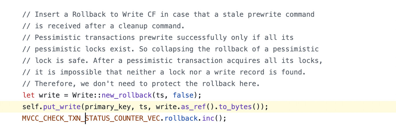 然而 Rollback 代码有一个特殊场景,并不会向 write cf 写入回滚记录,代码见: