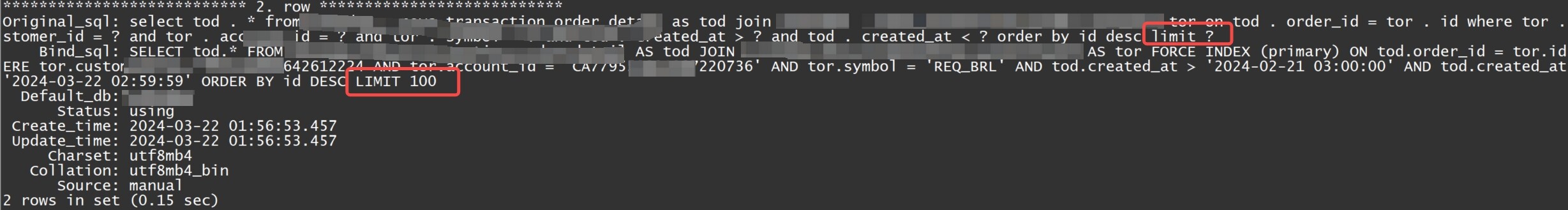 忘记说了,这个问题背景是两个表连接强制走主键了,做了执行计划绑定tor FORCE INDEX (primary) on tod.order_id = tor.id,用的limit 100;这个语句绑定的,然而limit 15 好像没有用上,但是我绑定limit 15,会覆盖limit 100的
