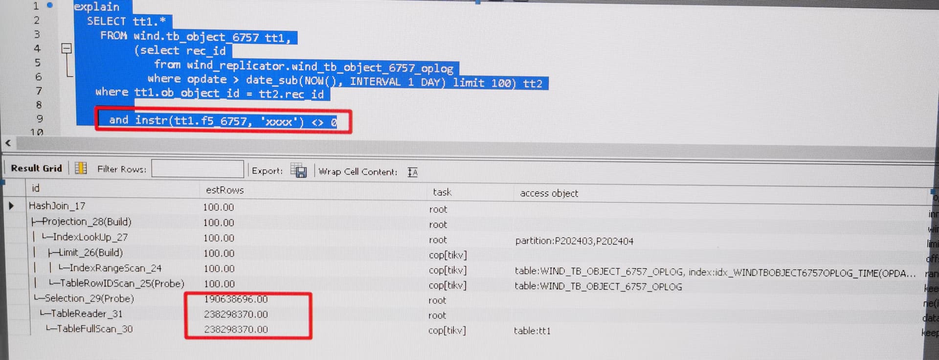 | │ └─TableRowIDScan_36(Probe) | 100.00 | cop[tikv] | table:WIND_TB_OBJECT_6757_OPLOG |