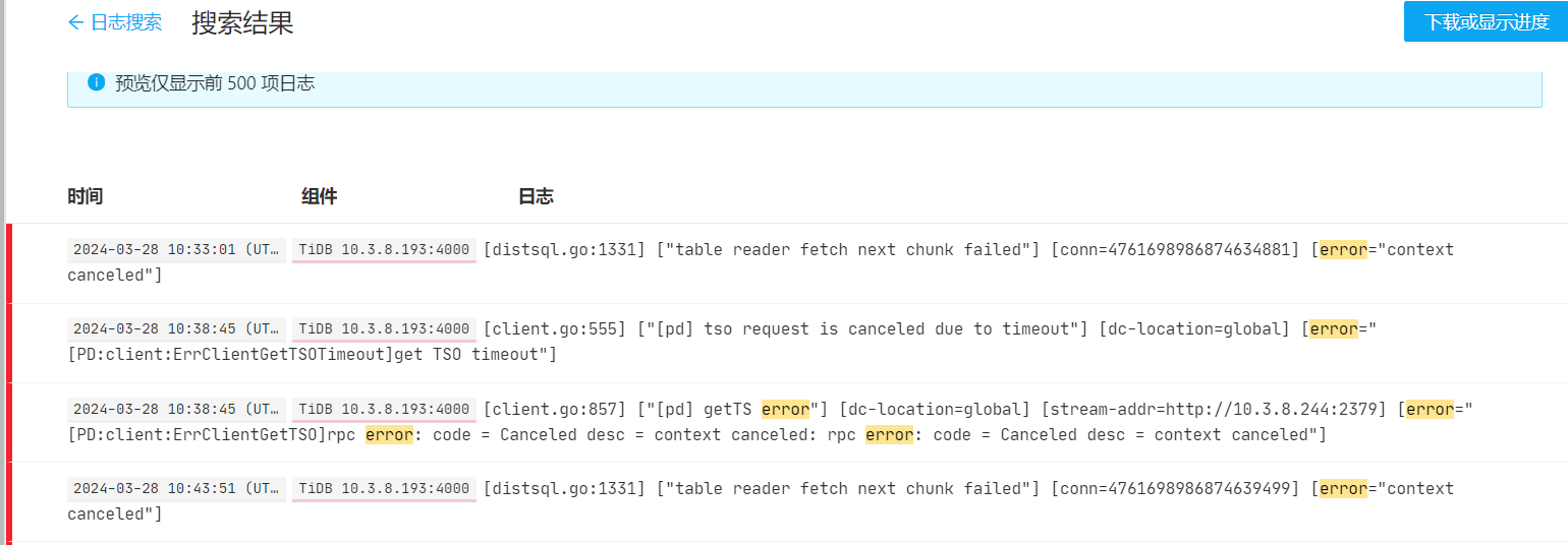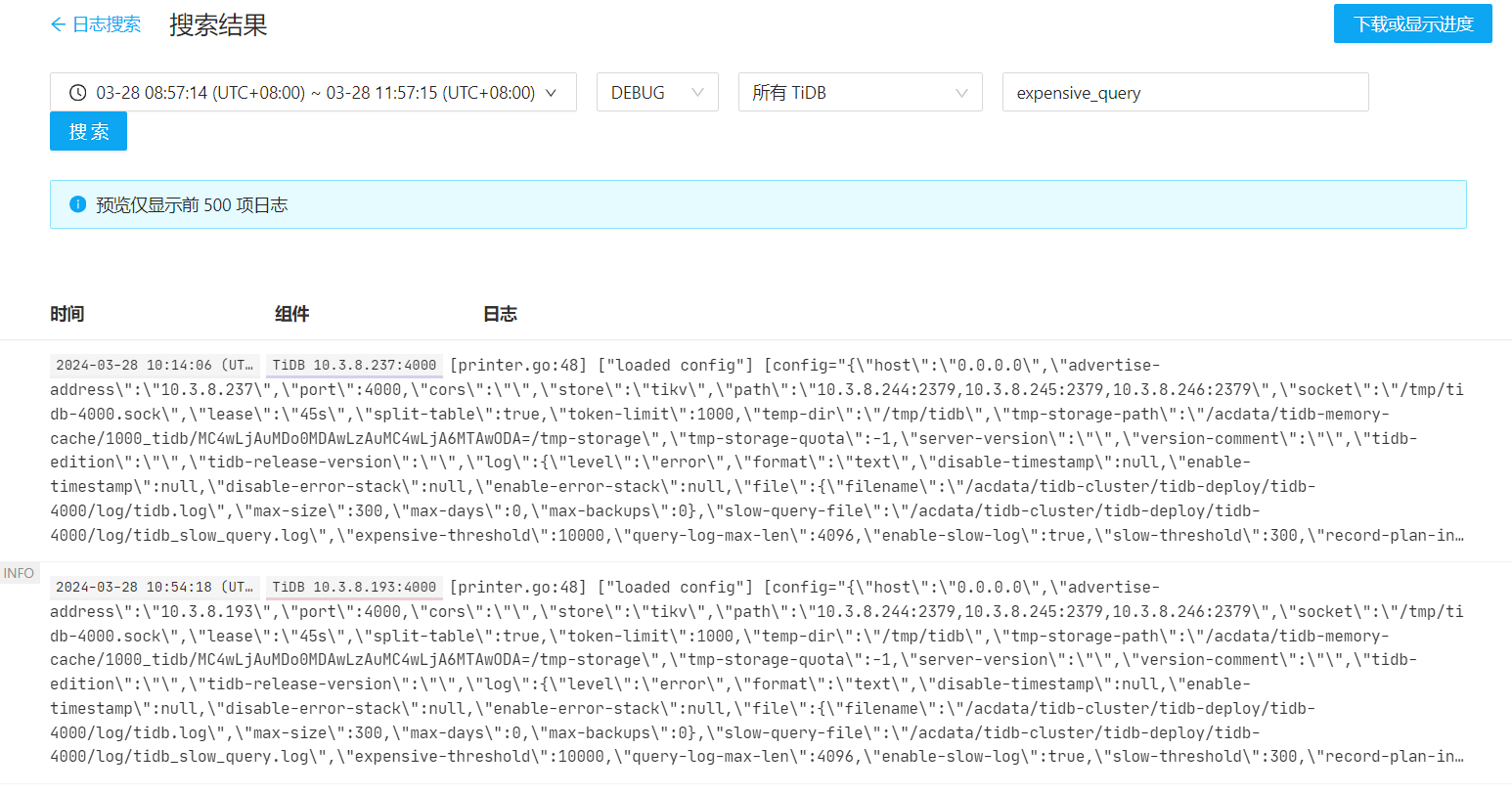 [printer.go:48] [“loaded config”] [config=“{"host":"0.0.0.0","advertise-address":"10.3.8.193","port":4000,"cors":"","store":"tikv","path":"10.3.8.244:2379,10.3.8.245:2379,10.3.8.246:2379","socket":"/tmp/tidb-4000.sock","lease":"45s","split-table":true,"token-limit":1000,"temp-dir":"/tmp/tidb","tmp-storage-path":"/acdata/tidb-memory-cache/1000_tidb/MC4wLjAuMDo0MDAwLzAuMC4wLjA6MTAwODA=/tmp-storage","tmp-storage-quota":-1,"server-version":"","version-comment":"","tidb-edition":"","tidb-release-version":"","log":{"level":"error","format":"text","disable-timestamp":null,"enable-timestamp":null,"disable-error-stack":null,"enable-error-stack":null,"file":{"filename":"/acdata/tidb-cluster/tidb-deploy/tidb-4000/log/tidb.log","max-size":300,"max-days":0,"max-backups":0},"slow-query-file":"/acdata/tidb-cluster/tidb-deploy/tidb-4000/log/tidb_slow_query.log","expensive-threshold":10000,"query-log-max-len":4096,"enable-slow-log":true,"slow-threshold":300,"record-plan-in-slow-log":1},"instance":{"tidb_general_log":false,"tidb_pprof_sql_cpu":false,"ddl_slow_threshold":300,"tidb_expensive_query_time_threshold":60,"tidb_enable_slow_log":true,"tidb_slow_log_threshold":300,"tidb_record_plan_in_slow_log":1,"tidb_check_mb4_value_in_utf8":true,"tidb_force_priority":"NO_PRIORITY","tidb_memory_usage_alarm_ratio":0.8,"tidb_enable_collect_execution_info":true,"plugin_dir":"/data/deploy/plugin","plugin_load":"","max_connections":0,"tidb_enable_ddl":true,"tidb_rc_read_check_ts":false},"security":{"skip-grant-table":false,"ssl-ca":"","ssl-cert":"","ssl-key":"","cluster-ssl-ca":"","cluster-ssl-cert":"","cluster-ssl-key":"","cluster-verify-cn":null,"session-token-signing-cert":"","session-token-signing-key":"","spilled-file-encryption-method":"plaintext","enable-sem":false,"auto-tls":false,"tls-version":"","rsa-key-size":4096,"secure-bootstrap":false,"auth-token-jwks":"","auth-token-refresh-interval":"1h0m0s","disconnect-on-expired-password":true},"status":{"status-host":"0.0.0.0","metrics-addr":"","status-port":10080,"metrics-interval":15,"report-status":true,"record-db-qps":false,"grpc-keepalive-time":10,"grpc-keepalive-timeout":3,"grpc-concurrent-streams":1024,"grpc-initial-window-size":2097152,"grpc-max-send-msg-size":2147483647},"performance":{"max-procs":30,"max-memory":0,"server-memory-quota":0,"stats-lease":"3s","stmt-count-limit":5000,"pseudo-estimate-ratio":0.8,"bind-info-lease":"3s","txn-entry-size-limit":6291456,"txn-total-size-limit":4221225472,"tcp-keep-alive":true,"tcp-no-delay":true,"cross-join":true,"distinct-agg-push-down":false,"projection-push-down":false,"max-txn-ttl":3600000,"index-usage-sync-lease":"0s","plan-replayer-gc-lease":"10m","gogc":100,"enforce-mpp":false,"stats-load-concurrency":5,"stats-load-queue-size":1000,"analyze-partition-concurrency-quota":16,"enable-stats-cache-mem-quota":false,"committer-concurrency":128,"run-auto-analyze":true,"force-priority":"NO_PRIORITY","memory-usage-alarm-ratio":0.8,"enable-load-fmsketch":false},"prepared-plan-cache":{"enabled":true,"capacity":100,"memory-guard-ratio":0.1},"opentracing":{"enable":false,"rpc-metrics":false,"sampler":{"type":"const","param":1,"sampling-server-url":"","max-operations":0,"sampling-refresh-interval":0},"reporter":{"queue-size":0,"buffer-flush-interval":0,"log-spans":false,"local-agent-host-port":""}},"proxy-protocol":{"networks":"","header-timeout":5},"pd-client":{"pd-server-timeout":3},"tikv-client":{"grpc-connection-count":4,"grpc-keepalive-time":10,"grpc-keepalive-timeout":3,"grpc-compression-type":"none","commit-timeout":"41s","async-commit":{"keys-limit":256,"total-key-size-limit":4096,"safe-window":2000000000,"allowed-clock-drift":500000000},"max-batch-size":128,"overload-threshold":200,"max-batch-wait-time":0,"batch-wait-size":8,"enable-chunk-rpc":true,"region-cache-ttl":600,"store-limit":0,"store-liveness-timeout":"1s","copr-cache":{"capacity-mb":1000},"ttl-refreshed-txn-size":33554432,"resolve-lock-lite-threshold":16},"binlog":{"enable":false,"ignore-error":false,"write-timeout":"15s","binlog-socket":"","strategy":"range"},"compatible-kill-query":false,"pessimistic-txn":{"max-retry-count":256,"deadlock-history-capacity":10,"deadlock-history-collect-retryable":false,"pessimistic-auto-commit":false,"constraint-check-in-place-pessimistic":true},"max-index-length":3072,"index-limit":64,"table-column-count-limit":1017,"graceful-wait-before-shutdown":0,"alter-primary-key":false,"treat-old-version-utf8-as-utf8mb4":true,"enable-table-lock":false,"delay-clean-table-lock":0,"split-region-max-num":1000,"top-sql":{"receiver-address":""},"repair-mode":false,"repair-table-list":,"isolation-read":{"engines":["tikv","tiflash","tidb"]},"new_collations_enabled_on_first_bootstrap":true,"experimental":{"allow-expression-index":false},"skip-register-to-dashboard":false,"enable-telemetry":true,"labels":{},"enable-global-index":false,"deprecate-integer-display-length":false,"enable-enum-length-limit":true,"stores-refresh-interval":60,"enable-tcp4-only":false,"enable-forwarding":false,"max-ballast-object-size":0,"ballast-object-size":0,"transaction-summary":{"transaction-summary-capacity":500,"transaction-id-digest-min-duration":2147483647},"enable-global-kill":true,"enable-batch-dml":false,"mem-quota-query":1073741824,"oom-action":"cancel","oom-use-tmp-storage":true,"check-mb4-value-in-utf8":true,"enable-collect-execution-info":true,"plugin":{"dir":"/data/deploy/plugin","load":""},"max-server-connections":0,"run-ddl":true,"tidb-max-reuse-chunk":64,"tidb-max-reuse-column":256}”]