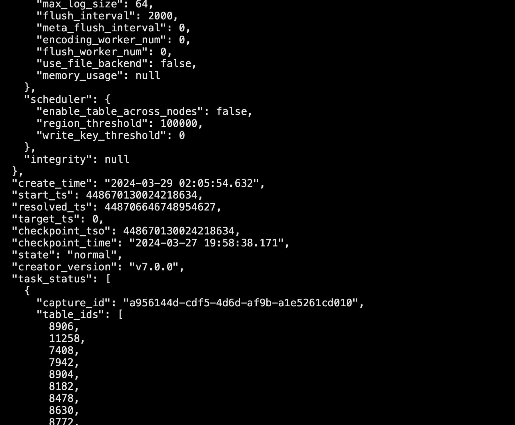如果数据量超过1T,建议对库中的比较大的表,进行cdc任务的单独拆分同步,其他的小表可以合并到一个任务同步。这样,便于观察发现,到底是哪个业务表同步数据时,被卡住。