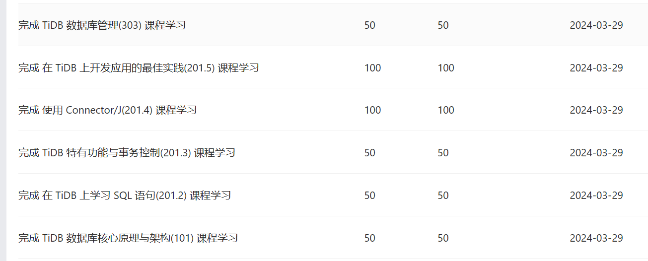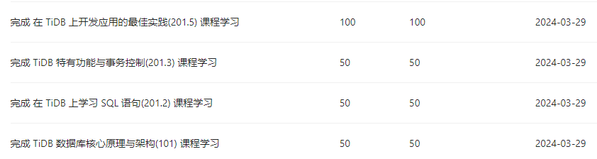 | 完成 TiDB 特有功能与事务控制(201.3)课程学习 |