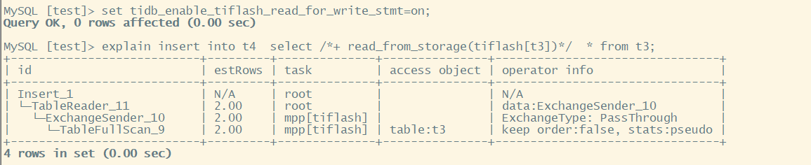 今天优化的时候发现,insert时的select不会走tiflash组件?即使hint了也没有走。之前一直用的4.0,之后升级到高版本后就没关注了。