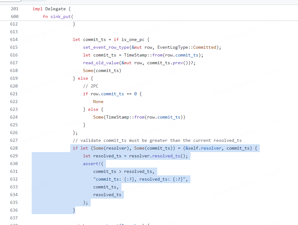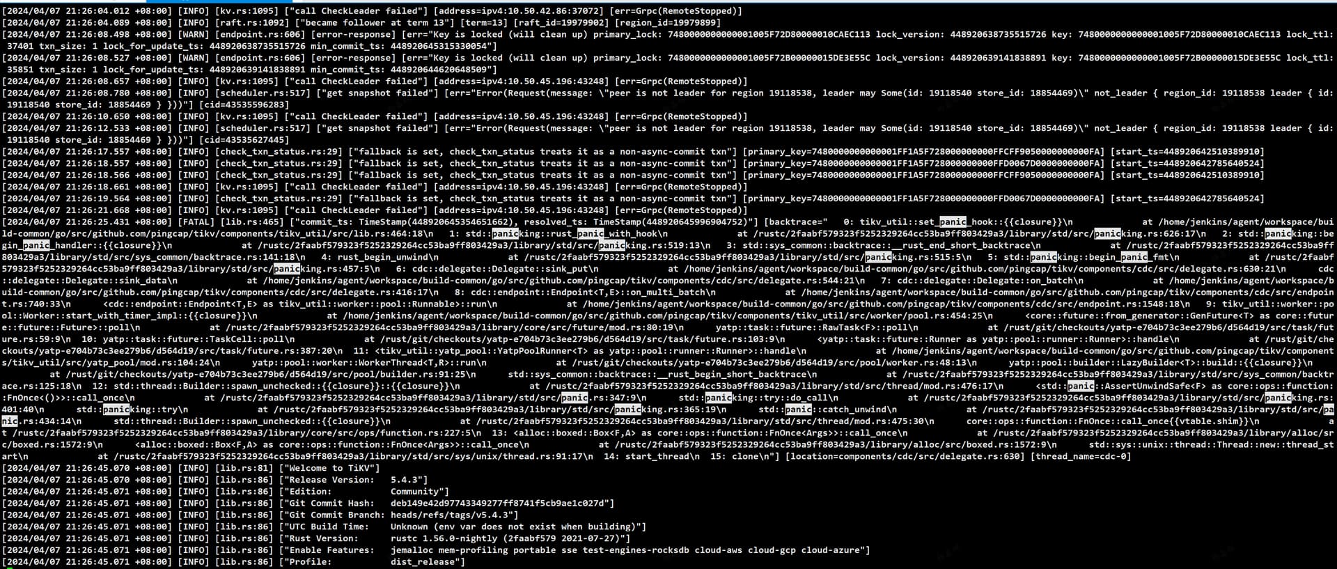 [2024/04/07 21:26:25.431 +08:00] [FATAL] [lib.rs:465] ["commit_ts: TimeStamp(448920645354651662), resolved_ts: TimeStamp(448920645996904752)"] [backtrace=" 0: tikv_util::set_panic_hook::{{closure}}\n at /home/jenkins/agent/workspace/build-common/go/src/github.com/pingcap/tikv/components/tikv_util/src/lib.rs:464:18\n 1: std::panicking::rust_panic_with_hook\n at /rustc/2faabf579323f5252329264cc53ba9ff803429a3/library/std/src/panicking.rs:626:17\n 2: std::panicking::begin_panic_handler::{{closure}}\n at /rustc/2faabf579323f5252329264cc53ba9ff803429a3/library/std/src/panicking.rs:519:13\n 3: std::sys_common::backtrace::__rust_end_short_backtrace\n at /rustc/2faabf579323f5252329264cc53ba9ff803429a3/library/std/src/sys_common/backtrace.rs:141:18\n 4: rust_begin_unwind\n at /rustc/2faabf579323f5252329264cc53ba9ff803429a3/library/std/src/panicking.rs:515:5\n 5: std::panicking::begin_panic_fmt\n at /rustc/2faabf579323f5252329264cc53ba9ff803429a3/library/std/src/panicking.rs:457:5\n 6: cdc::delegate::Delegate::sink_put\n at /home/jenkins/agent/workspace/build-common/go/src/github.com/pingcap/tikv/components/cdc/src/delegate.rs:630:21\n cdc::delegate::Delegate::sink_data\n at /home/jenkins/agent/workspace/build-common/go/src/github.com/pingcap/tikv/components/cdc/src/delegate.rs:544:21\n 7: cdc::delegate::Delegate::on_batch\n at /home/jenkins/agent/workspace/build-common/go/src/github.com/pingcap/tikv/components/cdc/src/delegate.rs:416:17\n 8: cdc::endpoint::Endpoint<T,E>::on_multi_batch\n at /home/jenkins/agent/workspace/build-common/go/src/github.com/pingcap/tikv/components/cdc/src/endpoint.rs:740:33\n <cdc::endpoint::Endpoint<T,E> as tikv_util::worker::pool::Runnable>::run\n at /home/jenkins/agent/workspace/build-common/go/src/github.com/pingcap/tikv/components/cdc/src/endpoint.rs:1548:18\n 9: tikv_util::worker::pool::Worker::start_with_timer_impl::{{closure}}\n at /home/jenkins/agent/workspace/build-common/go/src/github.com/pingcap/tikv/components/tikv_util/src/worker/pool.rs:454:25\n <core::future::from_generator::GenFuture<T> as core::future::future::Future>::poll\n at /rustc/2faabf579323f5252329264cc53ba9ff803429a3/library/core/src/future/mod.rs:80:19\n yatp::task::future::RawTask<F>::poll\n at /rust/git/checkouts/yatp-e704b73c3ee279b6/d564d19/src/task/future.rs:59:9\n 10: yatp::task::future::TaskCell::poll\n at /rust/git/checkouts/yatp-e704b73c3ee279b6/d564d19/src/task/future.rs:103:9\n <yatp::task::future::Runner as yatp::pool::runner::Runner>::handle\n at /rust/git/checkouts/yatp-e704b73c3ee279b6/d564d19/src/task/future.rs:387:20\n 11: <tikv_util::yatp_pool::YatpPoolRunner<T> as yatp::pool::runner::Runner>::handle\n at /home/jenkins/agent/workspace/build-common/go/src/github.com/pingcap/tikv/components/tikv_util/src/yatp_pool/mod.rs:104:24\n yatp::pool::worker::WorkerThread<T,R>::run\n at /rust/git/checkouts/yatp-e704b73c3ee279b6/d564d19/src/pool/worker.rs:48:13\n yatp::pool::builder::LazyBuilder<T>::build::{{closure}}\n at /rust/git/checkouts/yatp-e704b73c3ee279b6/d564d19/src/pool/builder.rs:91:25\n std::sys_common::backtrace::__rust_begin_short_backtrace\n at /rustc/2faabf579323f5252329264cc53ba9ff803429a3/library/std/src/sys_common/backtrace.rs:125:18\n 12: std::thread::Builder::spawn_unchecked::{{closure}}::{{closure}}\n at /rustc/2faabf579323f5252329264cc53ba9ff803429a3/library/std/src/thread/mod.rs:476:17\n <std::panic::AssertUnwindSafe<F> as core::ops::function::FnOnce<()>>::call_once\n at /rustc/2faabf579323f5252329264cc53ba9ff803429a3/library/std/src/panic.rs:347:9\n std::panicking::try::do_call\n at /rustc/2faabf579323f5252329264cc53ba9ff803429a3/library/std/src/panicking.rs:401:40\n std::panicking::try\n at /rustc/2faabf579323f5252329264cc53ba9ff803429a3/library/std/src/panicking.rs:365:19\n std::panic::catch_unwind\n at /rustc/2faabf579323f5252329264cc53ba9ff803429a3/library/std/src/panic.rs:434:14\n std::thread::Builder::spawn_unchecked::{{closure}}\n at /rustc/2faabf579323f5252329264cc53ba9ff803429a3/library/std/src/thread/mod.rs:475:30\n core::ops::function::FnOnce::call_once{{vtable.shim}}\n at /rustc/2faabf579323f5252329264cc53ba9ff803429a3/library/core/src/ops/function.rs:227:5\n 13: <alloc::boxed::Box<F,A> as core::ops::function::FnOnce<Args>>::call_once\n at /rustc/2faabf579323f5252329264cc53ba9ff803429a3/library/alloc/src/boxed.rs:1572:9\n <alloc::boxed::Box<F,A> as core::ops::function::FnOnce<Args>>::call_once\n at /rustc/2faabf579323f5252329264cc53ba9ff803429a3/library/alloc/src/boxed.rs:1572:9\n std::sys::unix::thread::Thread::new::thread_start\n at /rustc/2faabf579323f5252329264cc53ba9ff803429a3/library/std/src/sys/unix/thread.rs:91:17\n 14: start_thread\n 15: clone\n"] [location=components/cdc/src/delegate.rs:630] [thread_name=cdc-0]