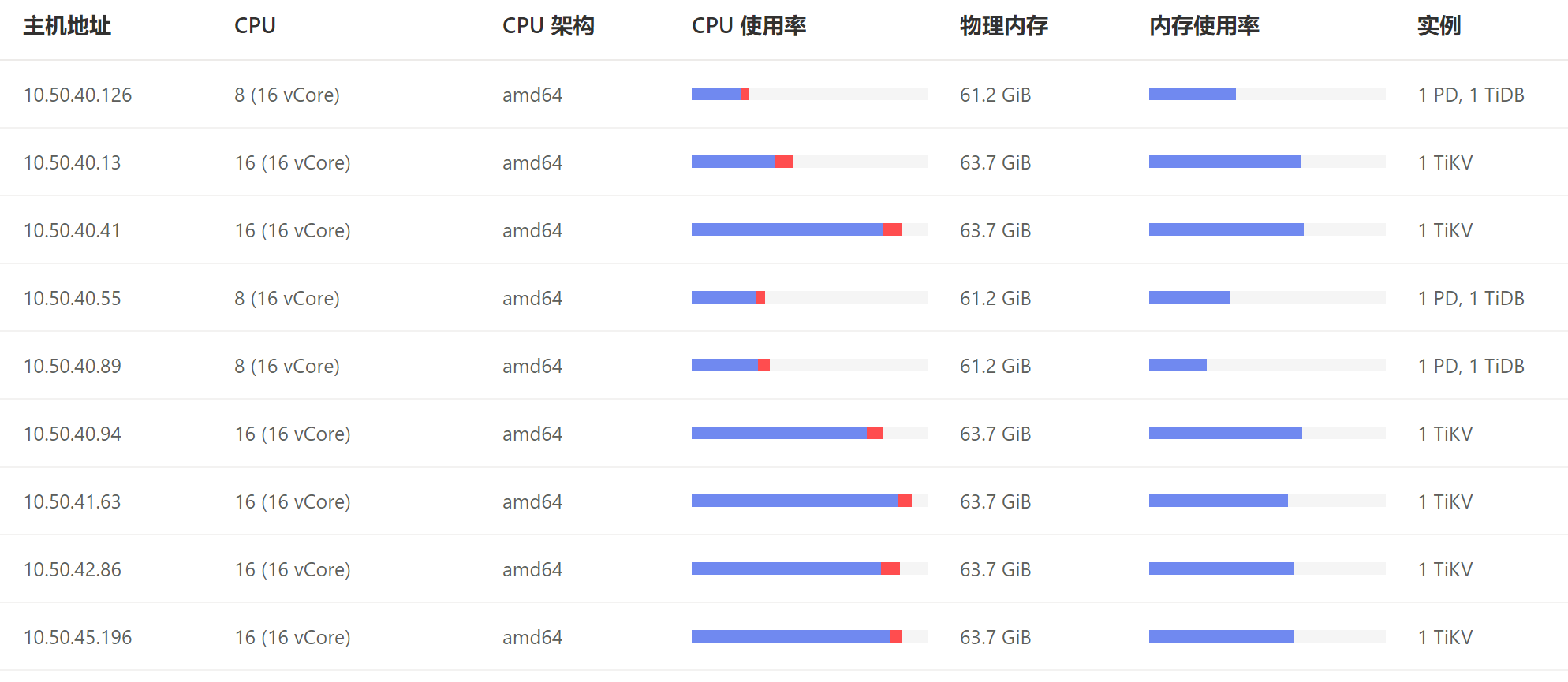 【资源配置】进入到 TiDB Dashboard -集群信息 (Cluster Info) -主机(Hosts) 截图此页面