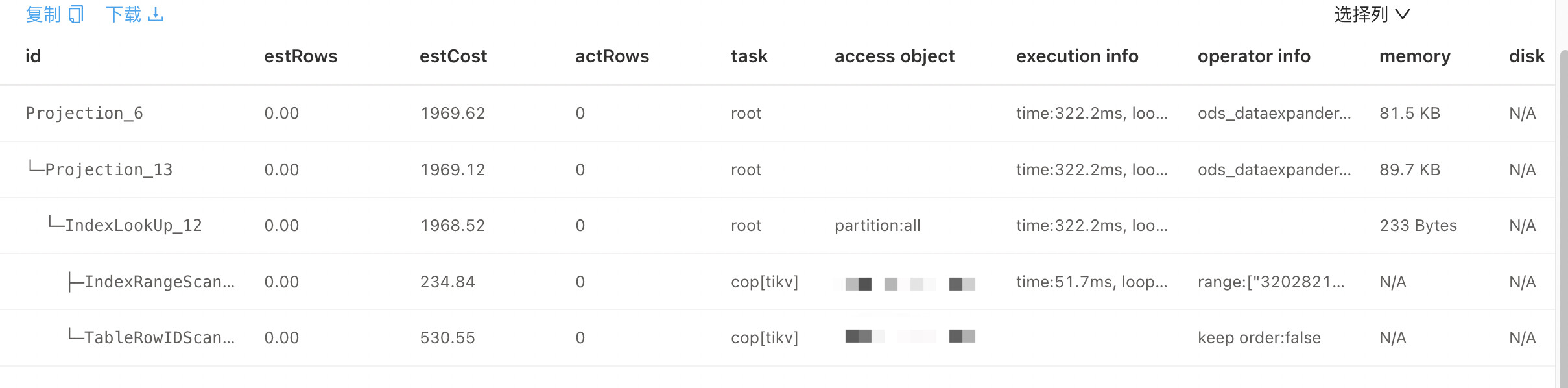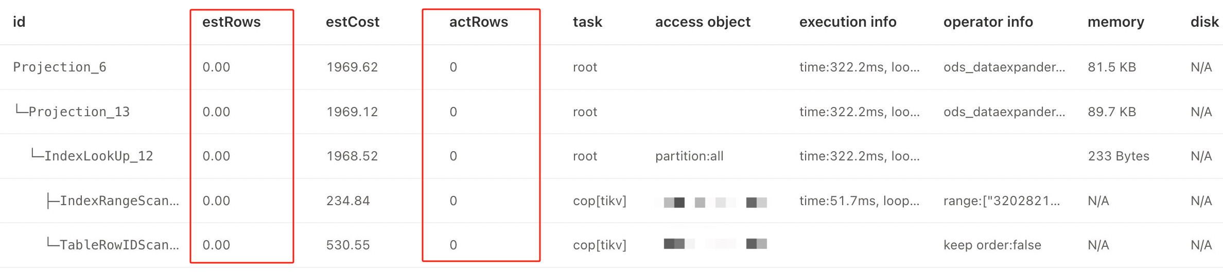 | ├─IndexRangeScan_10(Build) | 0.00 | 234.84 | 0 | cop[tikv] | table:t_hr, index:idx_customer_id(customer_id) | time:51.7ms, loops:41, cop_task: {num: 41, max: 270.6ms, min: 545.5µs, avg: 7.61ms, p95: 1.74ms, rpc_num: 41, rpc_time: 309.6ms, copr_cache_hit_ratio: 0.02, distsql_concurrency: 15}, tikv_task:{proc max:3ms, min:0s, avg: 292.7µs, p80:1ms, p95:1ms, iters:41, tasks:41}, scan_detail: {total_keys: 40, get_snapshot_time: 917µs, rocksdb: {block: {cache_hit_count: 492}}} | range:["320282199601025723","320282199601025723"], keep order:false | N/A | N/A |