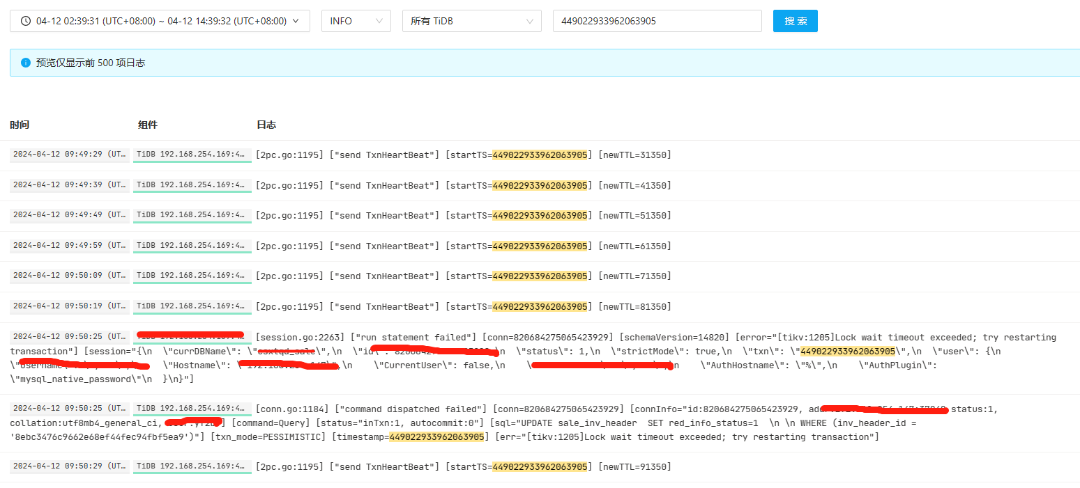 拿txn号在日志里搜 这个事务已经提示等待锁超时了 应该是已经报错给客户端了吧