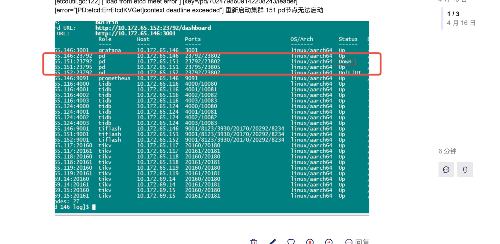 [{“id”:9357444448847789453,“peerURLs”:[“http://10.172.65.152:23802”],“name”:“pd-10.172.65.152-23792”,“clientURLs”:[“http://10.172.65.152:23792”]},{“id”:11468259817903508096,“peerURLs”:[“http://10.172.65.151:23805”],“name”:“pd-10.172.65.151-23795”,“clientURLs”:[“http://10.172.65.151:23795”]},{“id”:12415486320424082229,“peerURLs”:[“http://10.172.65.151:23802”],“name”:“pd-10.172.65.151-23792”,“clientURLs”:[“http://10.172.65.151:23792”]},{“id”:14508203407204661733,“peerURLs”:[“http://10.172.65.146:23802”],“name”:“pd-10.172.65.146-23792”,“clientURLs”:[“http://10.172.65.146:23792”]}]
