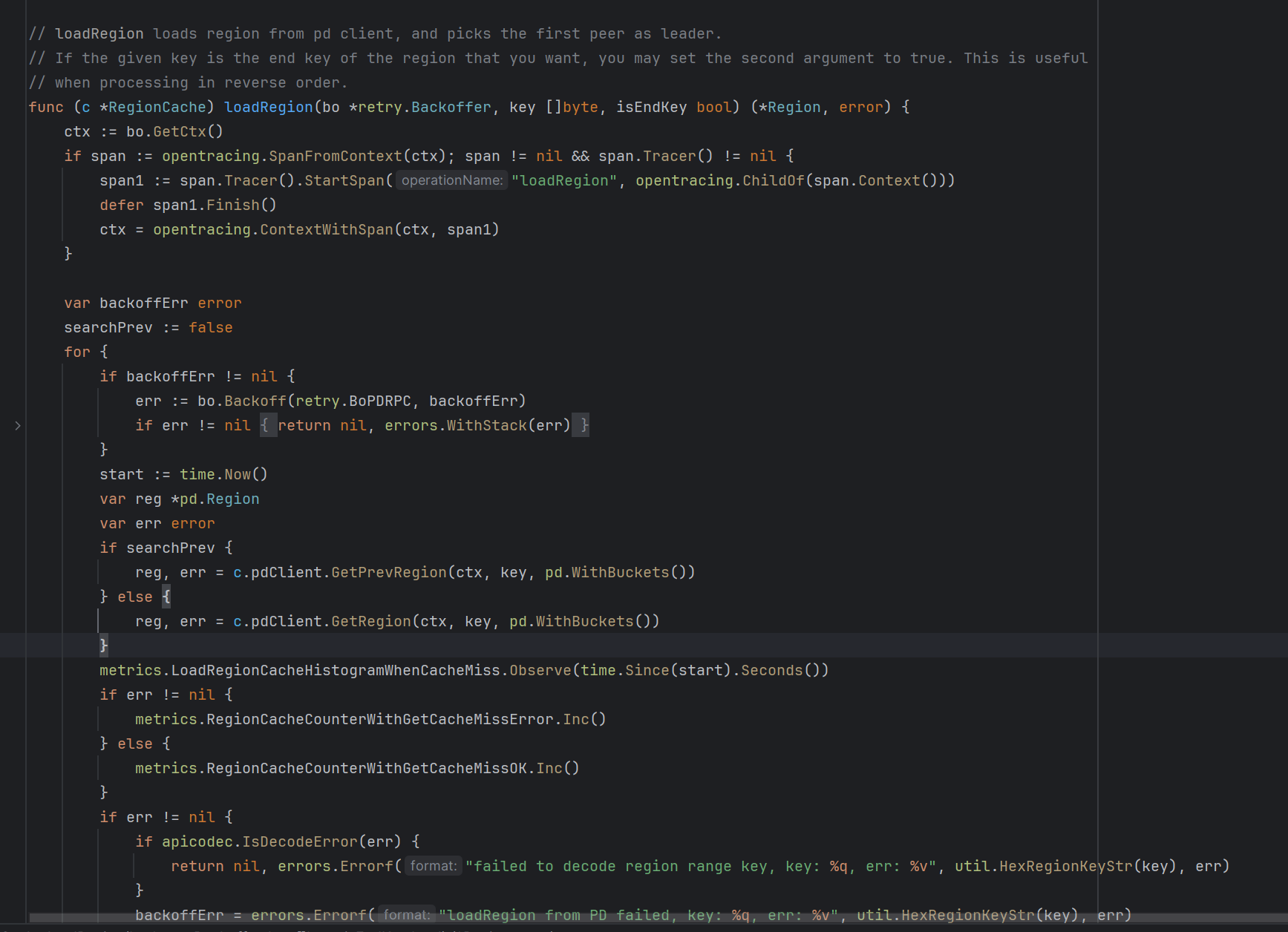 使用场景:部署了 pd + tikv 作为纯 kv 使用,使用 go-client 的 rawkv 连接 pd 进行读写,发现同一个 client 使用一段时间后就会出现 loadRegion from PD failed, key: “395F3130303130343235343932395F30303030303030313431”, err: rpc error 的报错,导致超时,且无法自动恢复,重新 new client 也无法解决,只能重启实例。