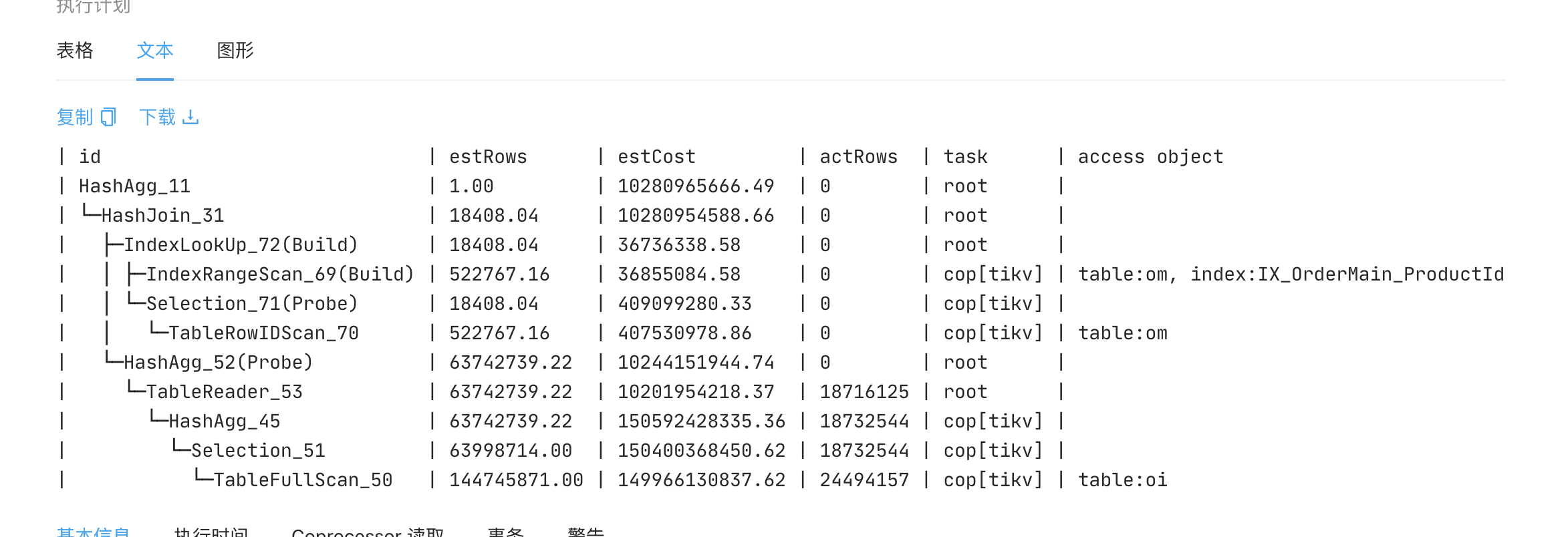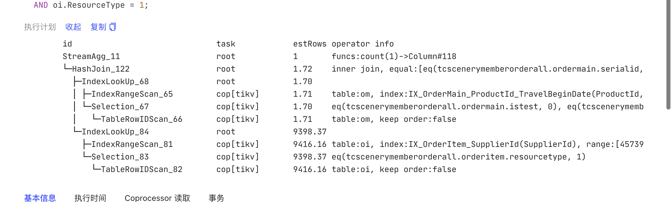 | │ ├─IndexRangeScan_65 | cop[tikv] | 1.71 | table:om, index:IX_OrderMain_ProductId_TravelBeginDate(ProductId, TravelBeginDate), range:[32558 2024-04-02 00:00:00,32558 2024-04-24 00:00:00), keep order:false | 23601 | time:924.9µs, loops:26, cop_task: {num: 1, max: 499.2µs, proc_keys: 0, rpc_num: 1, rpc_time: 474.7µs, copr_cache_hit_ratio: 1.00}, tikv_task:{time:15ms, loops:28}, scan_detail: {total_process_keys: 0, total_keys: 0, rocksdb: {delete_skipped_count: 0, key_skipped_count: 0, block: {cache_hit_count: 0, read_count: 0, read_byte: 0 Bytes}}} | N/A | N/A | |