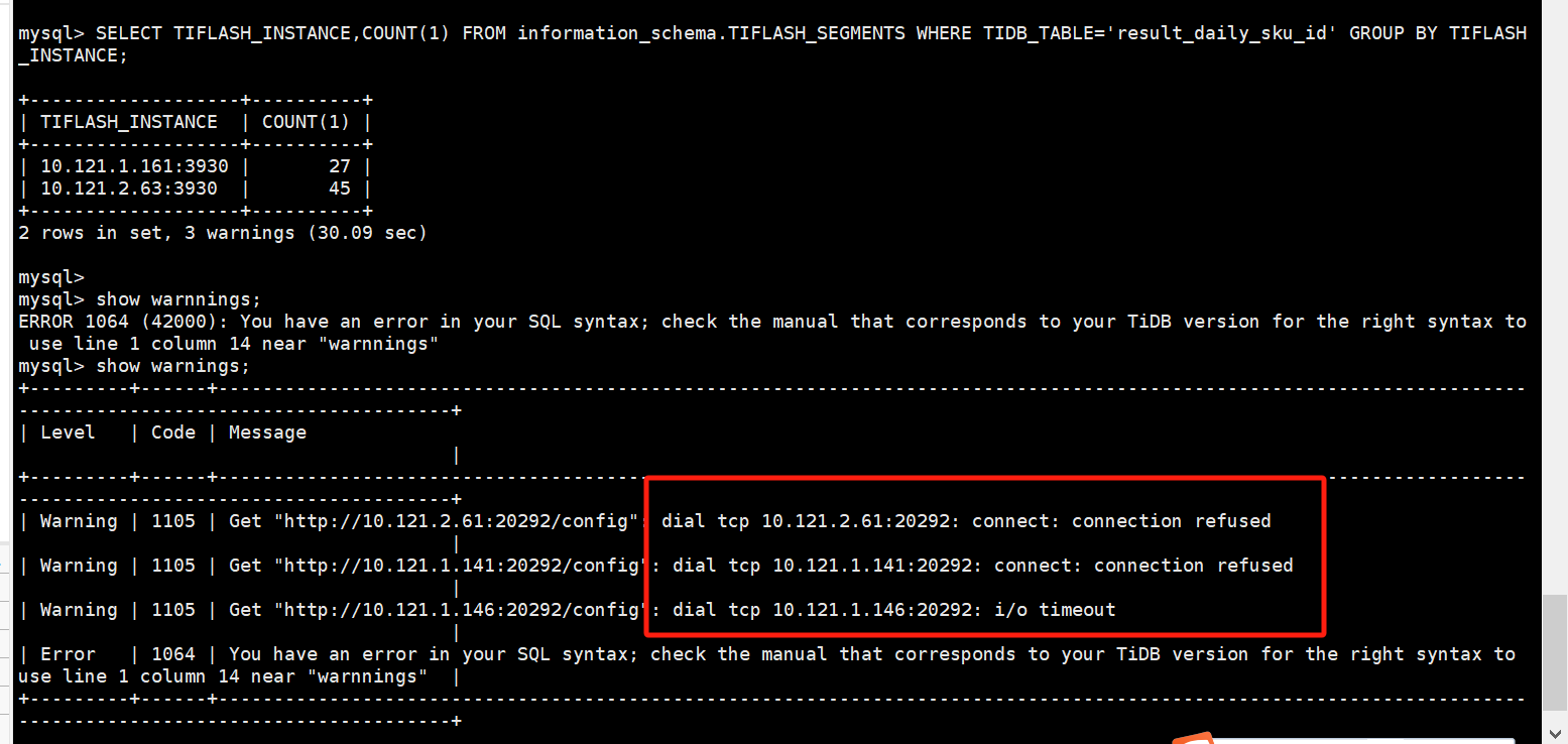 3 - 在控制台查看tiflash segement信息时,也显示其他几个节点连接失败