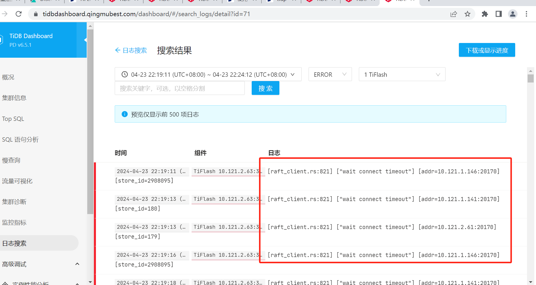 2 - tidbdashboard日志中有报错信息,显示2台正常节点还是会去连接这三个节点,但显示连接超时