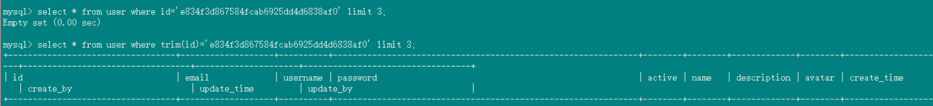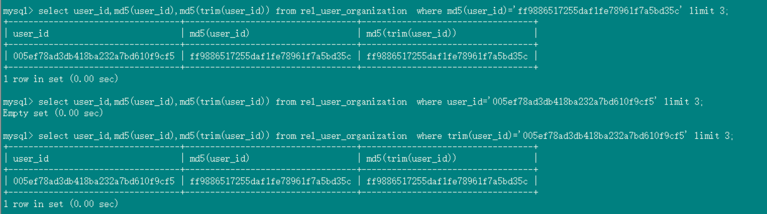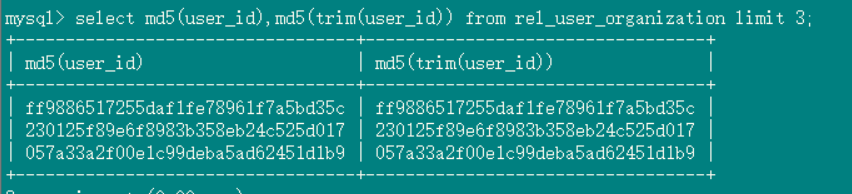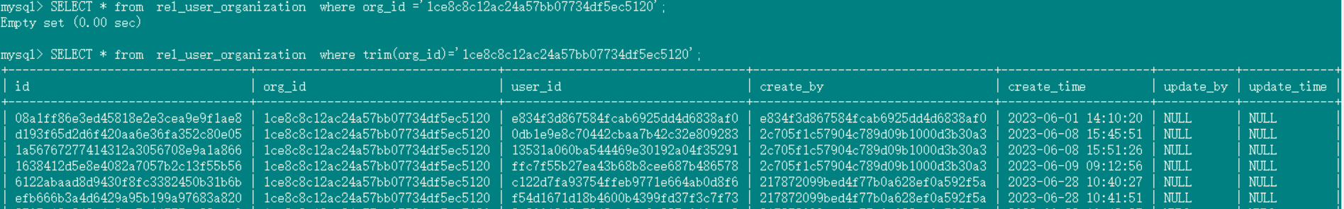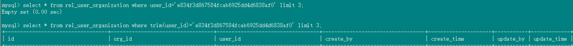 SELECT * from rel_user_organization where trim(org_id) =‘1ce8c8c12ac24a57bb07734df5ec5120’; 能查到数据