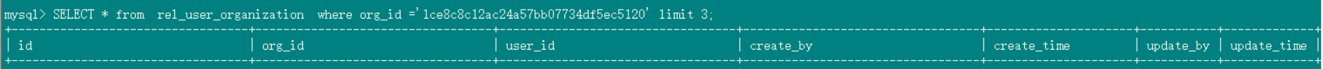 SELECT * from rel_user_organization where org_id =‘1ce8c8c12ac24a57bb07734df5ec5120’;查不出数据