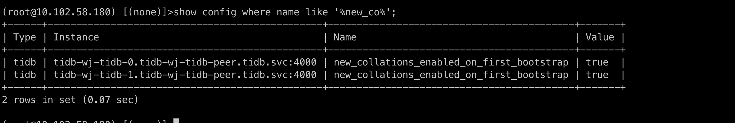 mysql> SELECT VARIABLE_VALUE FROM mysql.tidb WHERE VARIABLE_NAME=‘new_collation_enabled’;