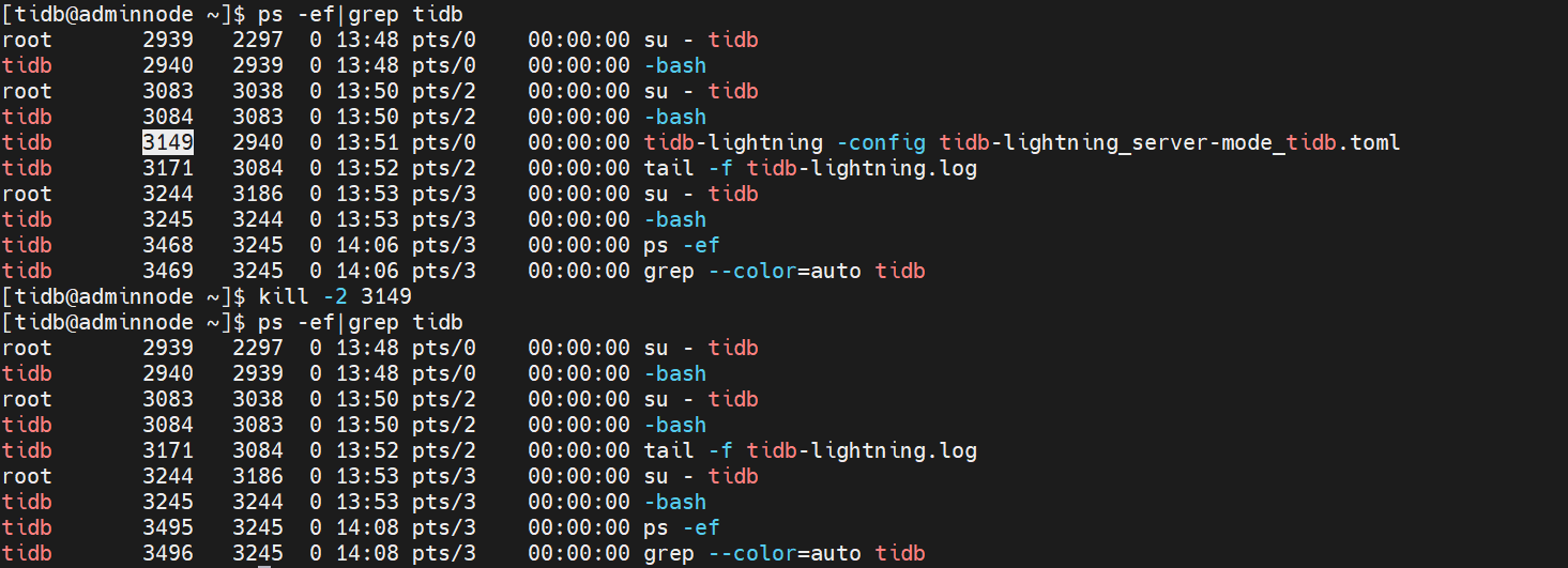 可以确认任务完成情况。确保完成之后应该可通过 ps aux | grep tidb-lightning 获取进程 ID,然后通过 kill -2 «pid» 结束进程。