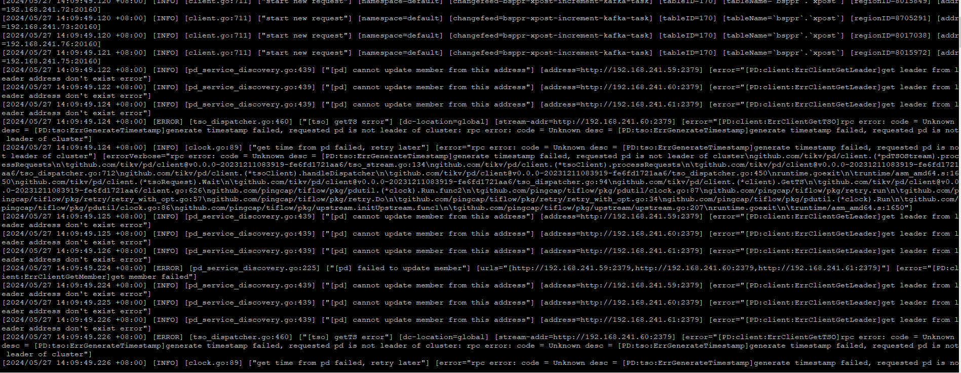 第一个日志应该是 pd leader 切换,后续的 info 可能和 tikv 滚动 leader 切换有关系。
