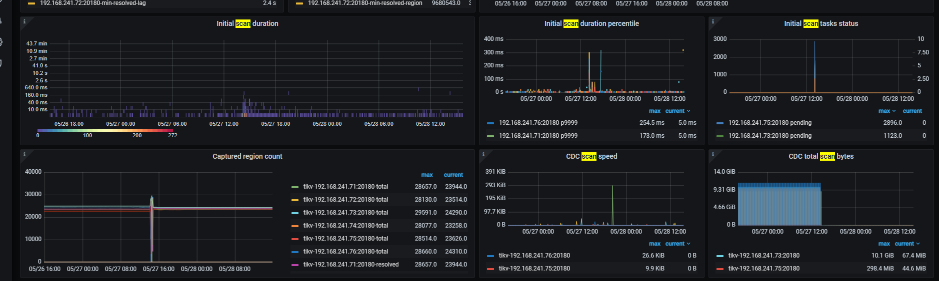 Grafana → CDC的dashboard → TiKV的Row → 三個Initial scan的panel