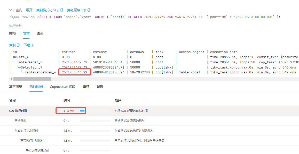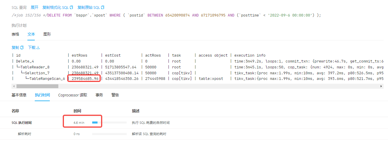 | └─Selection_7 | 230688321.49 | 435137300408.14 | 50000 | cop[tikv] | | tikv_task:{proc max:1.99s, min:10ms, avg: 397.2ms, p80:526.5ms, p95:742.7ms, iters:290274, tasks:4924}, scan_detail: {total_process_keys: 274445988, total_process_keys_size: 337825055131, total_keys: 275092768, get_snapshot_time: 10.2s, rocksdb: {delete_skipped_count: 678094, key_skipped_count: 550436231, block: {cache_hit_count: 120229, read_count: 5747801, read_byte: 114.1 GB, read_time: 2m30.3s}}} | lt(bsppr.xpost.posttime, 2022-09-06 00:00:00.000000) | N/A | N/A |