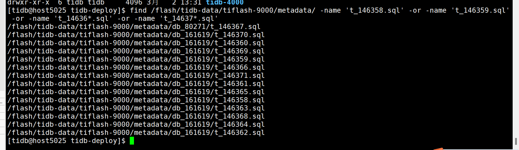 find /flash/tidb-data/tiflash-9000/metadata/ -name 't_146358.sql' -or -name 't_146359.sql' -or -name 't_14636*.sql' -or -name 't_14637*.sql'