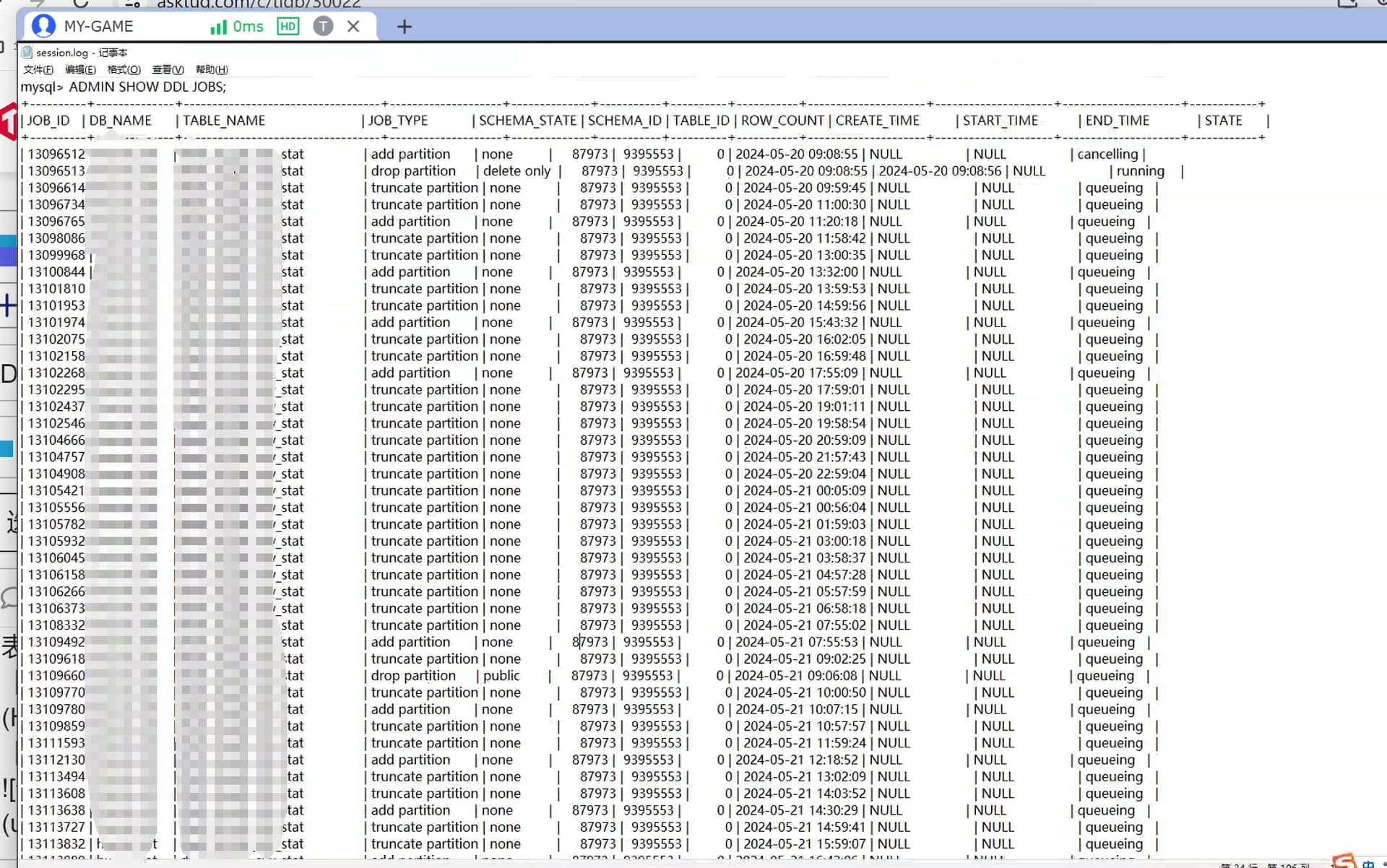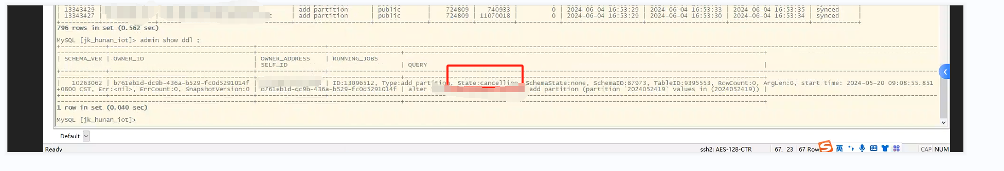 生成环境明天会增加分区和删除分区。5月20号后一个表生成分区卡住,导致后续堆积很多DDL任务。重启集群后其他表的DDL也卡住。修改own_id和重启集群问题没解决。只是重启集群8个多小时后,其他表的DDL操作能执行。
