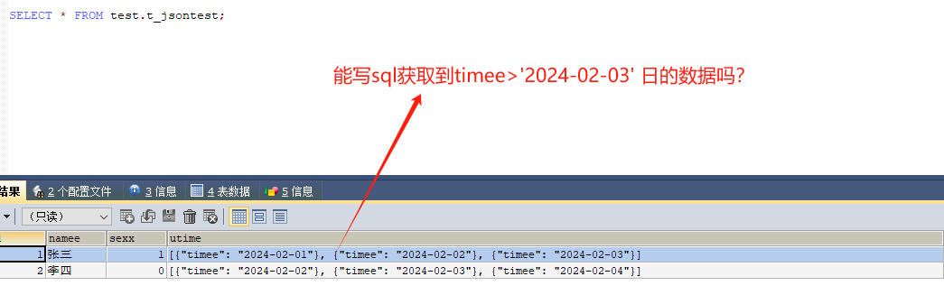 select * from (select *,json_extract(utime,‘$[0].timee’) as ut from t_josontest) aa where ut > ‘2024-02-03’;