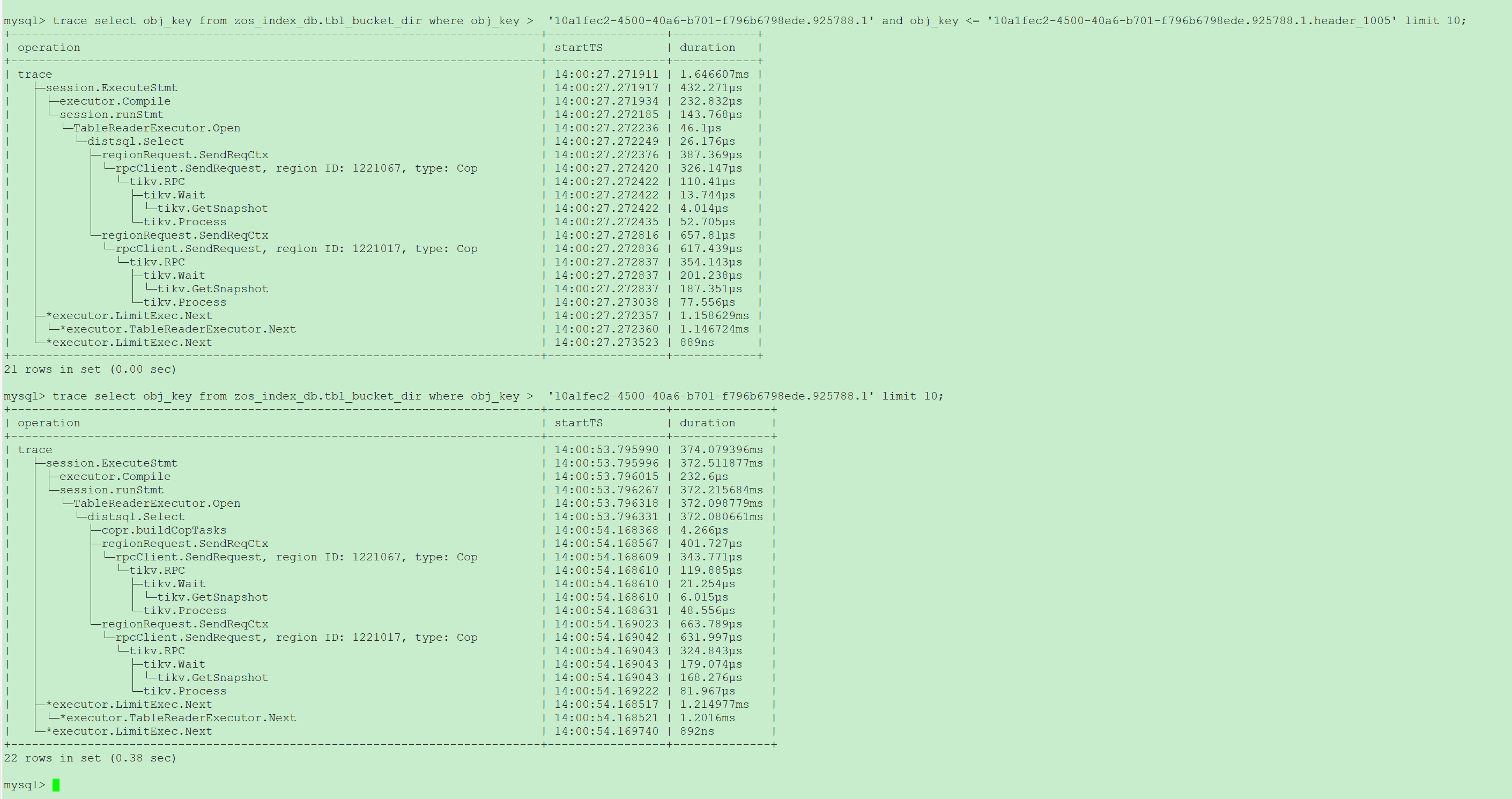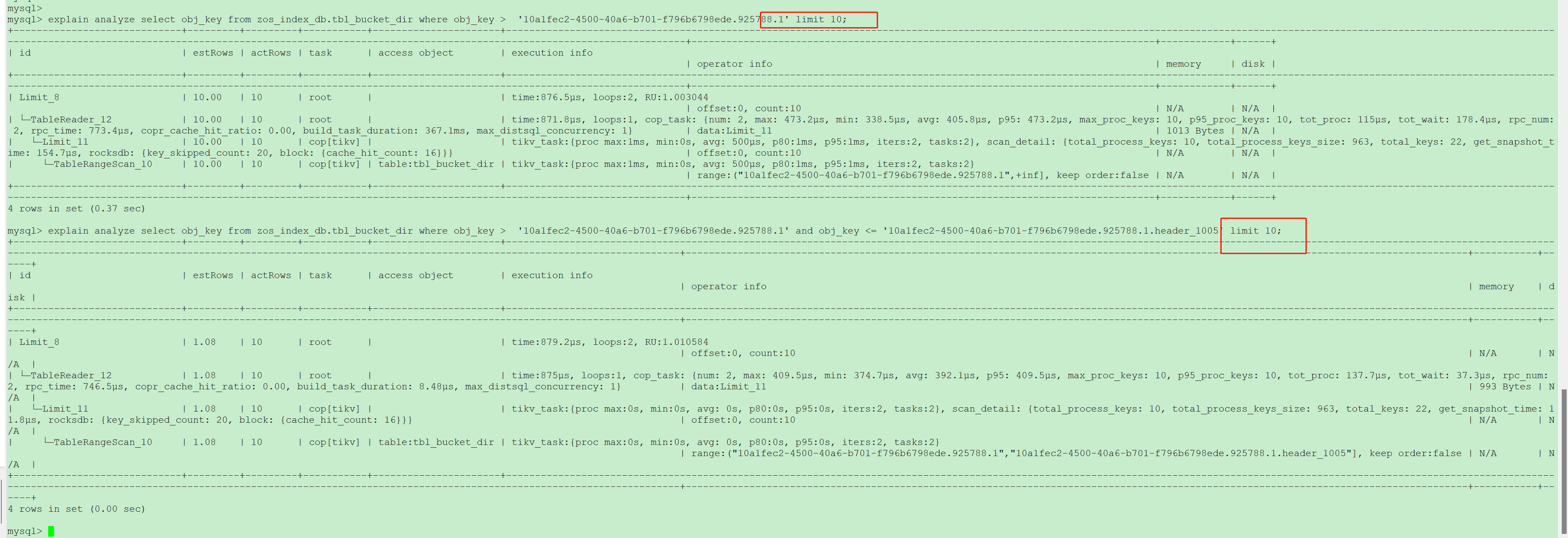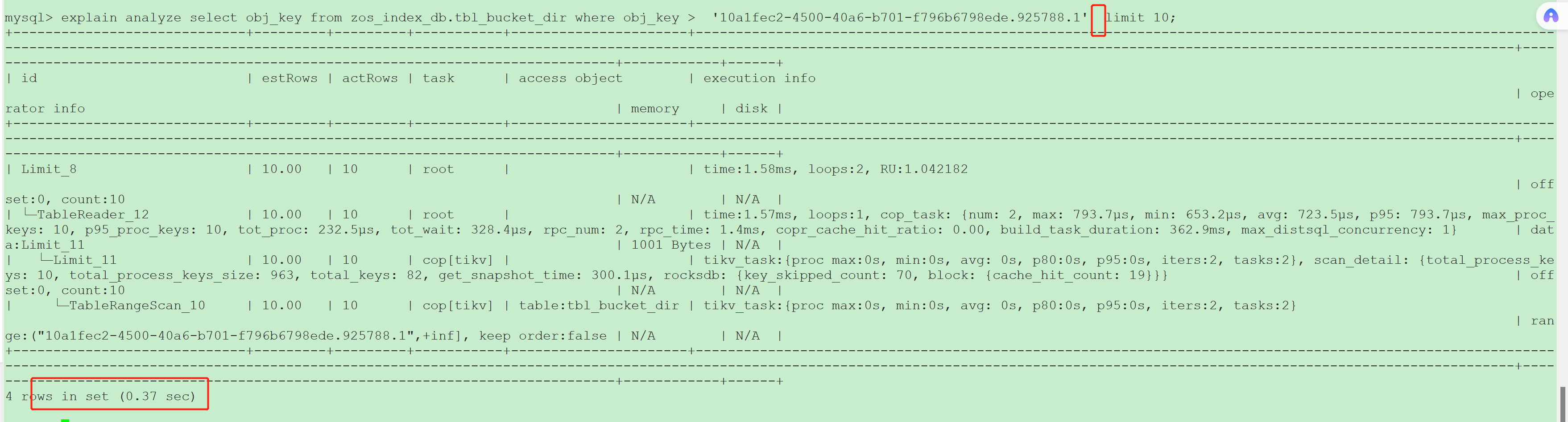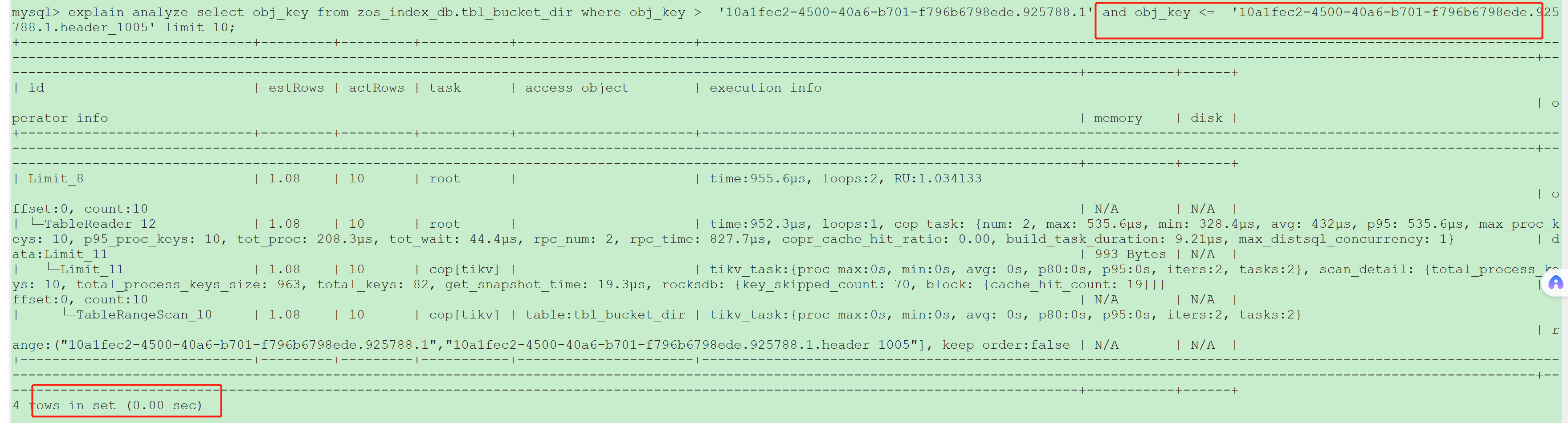 我的数据在tikv上按照主键有序存储的, 这里查询到是10条连续的数据,应该都分布在一个分片上,也就是说从单个tikv返回就行了,不需要到所有的tikv上去查询。