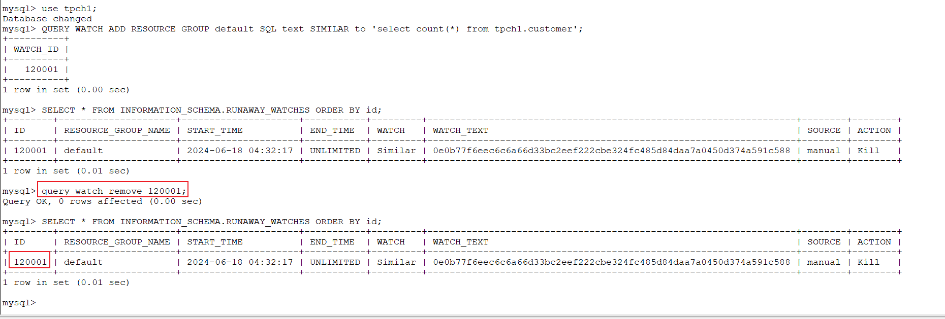 QUERY WATCH ADD RESOURCE GROUP default SQL text SIMILAR to 'select count(*) from tpch1.customer';