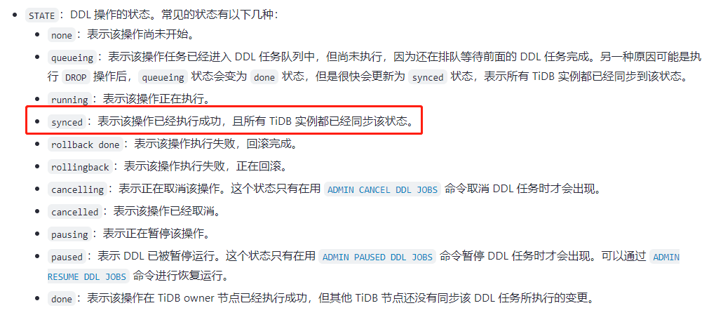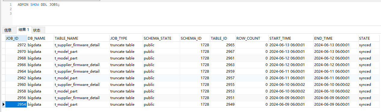 发现数据库中有几个ddl卡了好几天了 ADMIN SHOW DDL JOBS;结果如下图