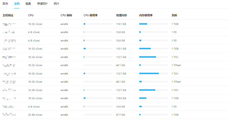 【资源配置】进入到 TiDB Dashboard -集群信息 (Cluster Info) -主机(Hosts) 截图此页面