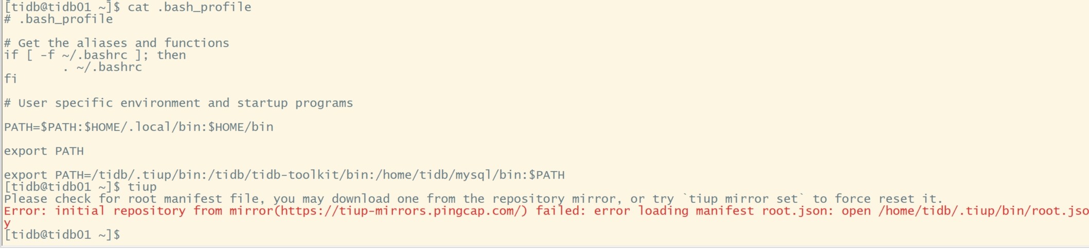 Error: initial repository from mirror(https://tiup-mirrors.pingcap.com/ ) failed: error loading manifest root.json: open /home/tidb/.tiup/bin/root.json: no such file or directory
