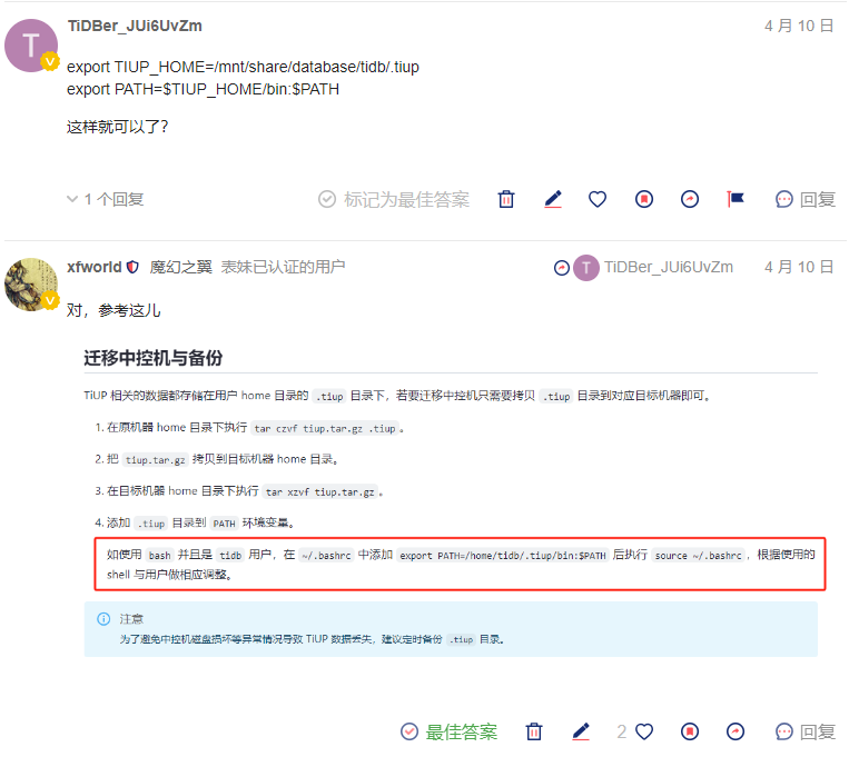 应该就是这样就可以了。看了一下官方文档,官方文档是从A机器的home迁移到B机器的home,所以没有设置修改TIUP_HOME。如果是同一台机器修改目录,应该是执行这个重新设置一下目录位置就可以了。
