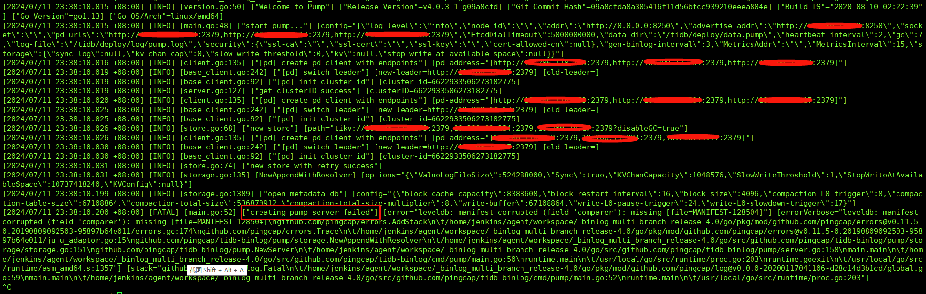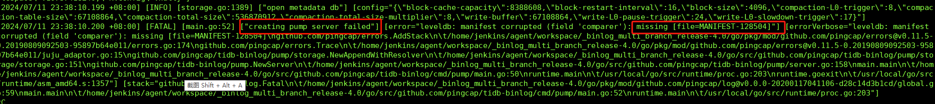 看起来文件损坏了,能容忍 drainer 缺失一部分,就重建 pump 吧