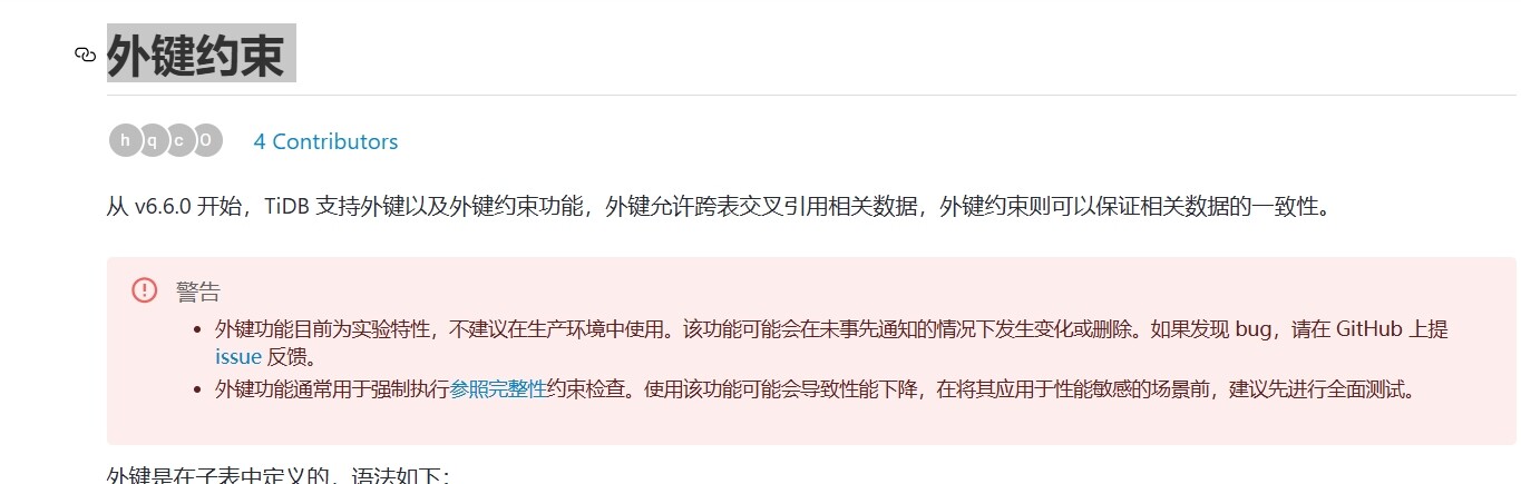 之前的TiDB文档里都说支持创建外键,但无实际功能后,就没有打算用这个外键了,全放业务代码上去控制。