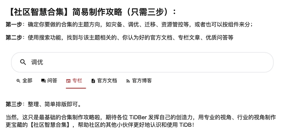 一键直达发布入口 >> 社区智慧合集 - TiDB 的问答社区